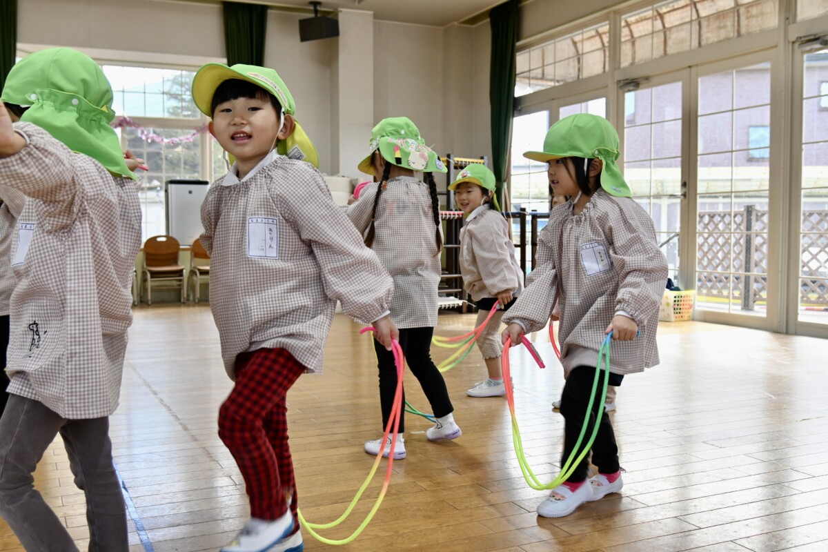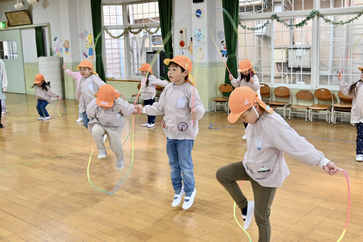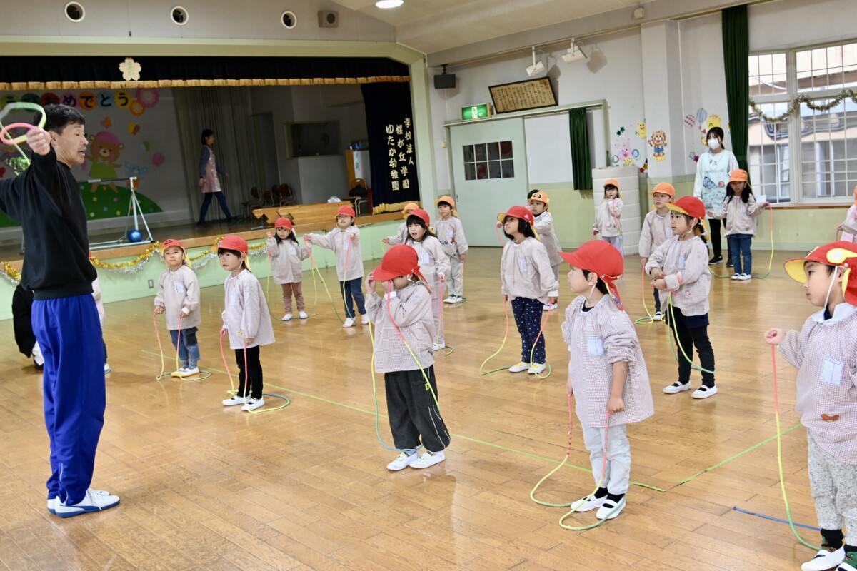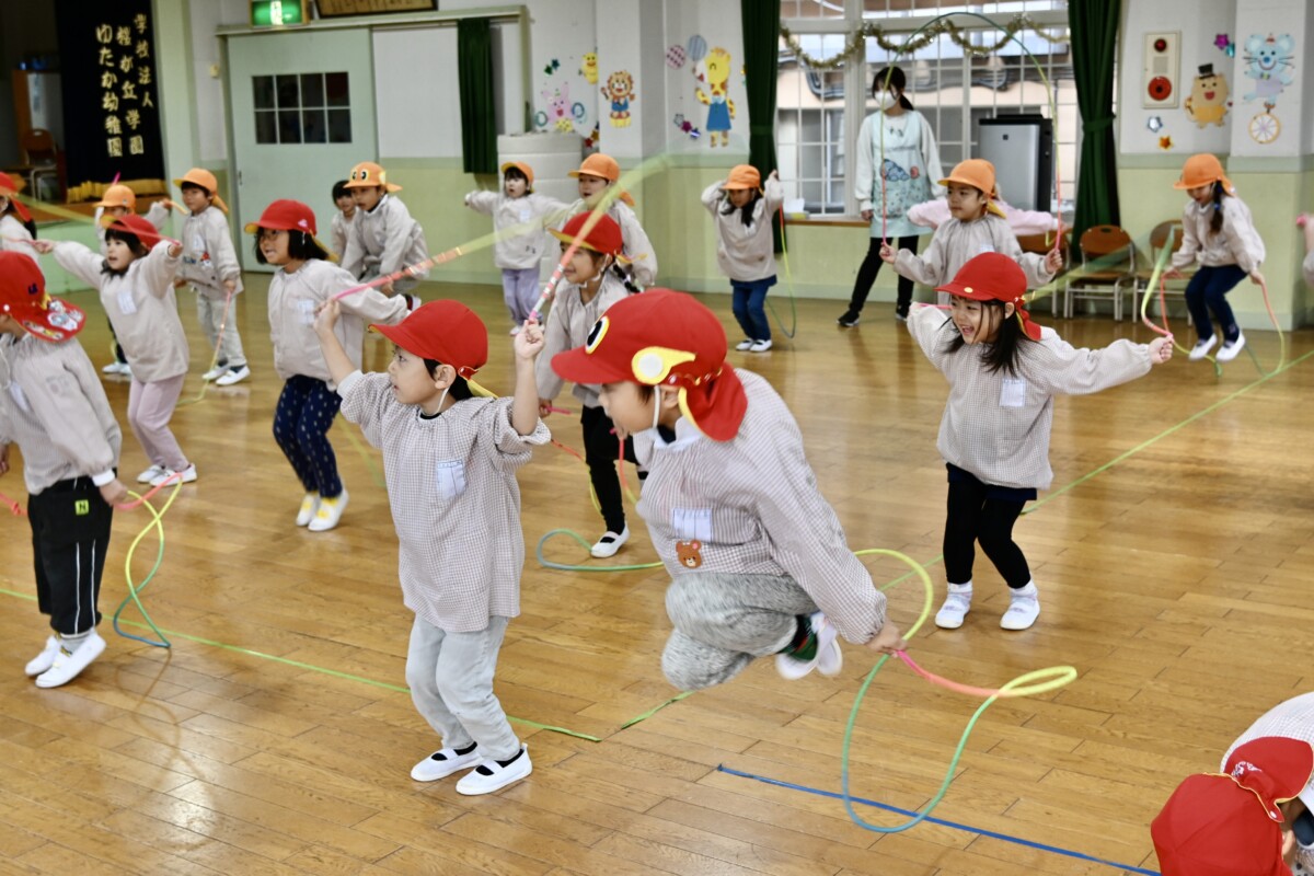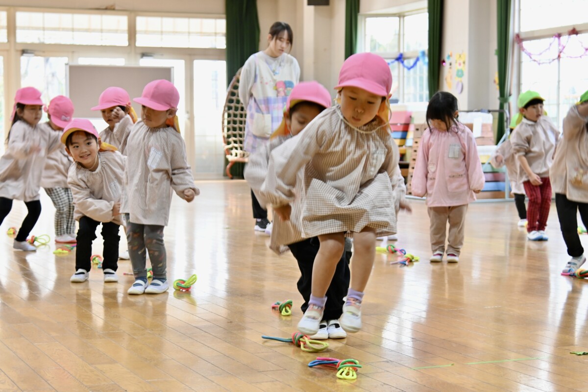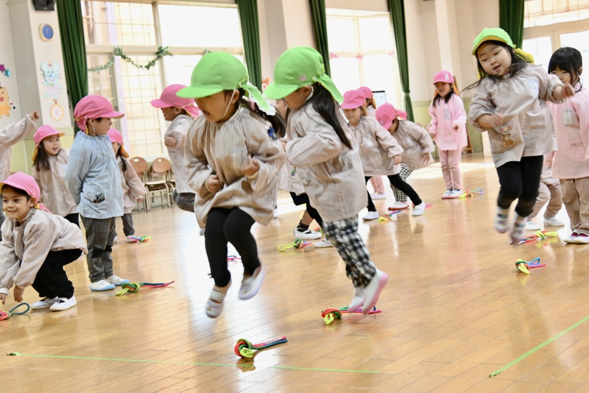 まずは年中組🎵年中組は、縄跳びで前跳び練習の真っ最中!!戸外遊びでも取り組んでいる子が多いので、連続で跳べる子もたくさん増えてきました。まだ連続では跳べない子も岡田先生にコツを教えてもらいながら挑戦していて、少しずつ上達目指して頑張っています☺️
