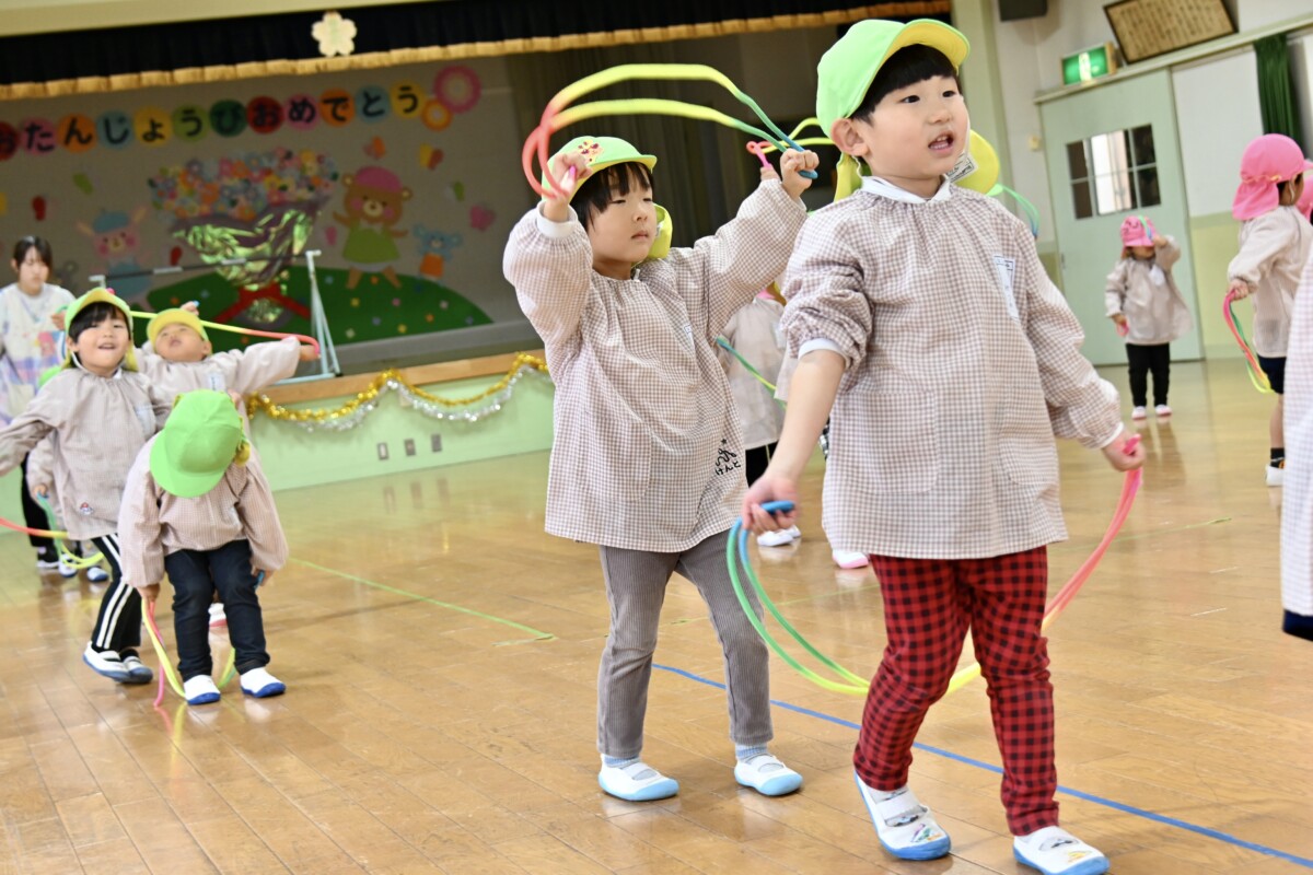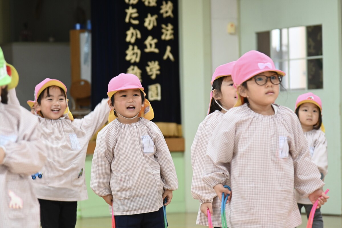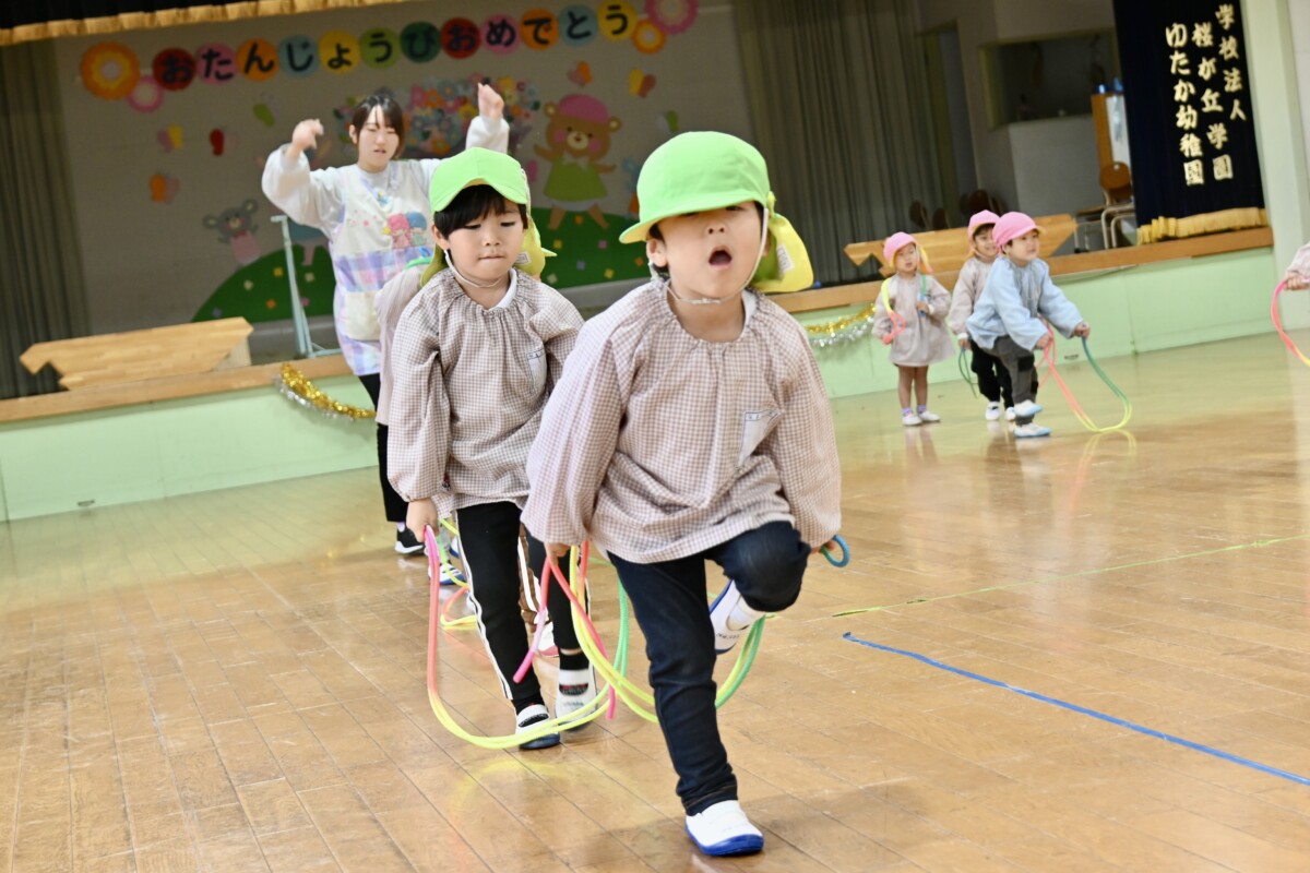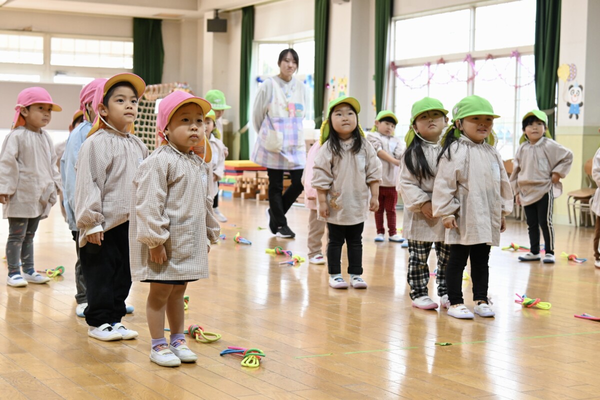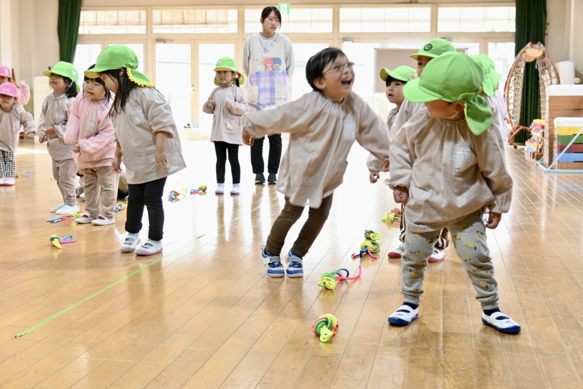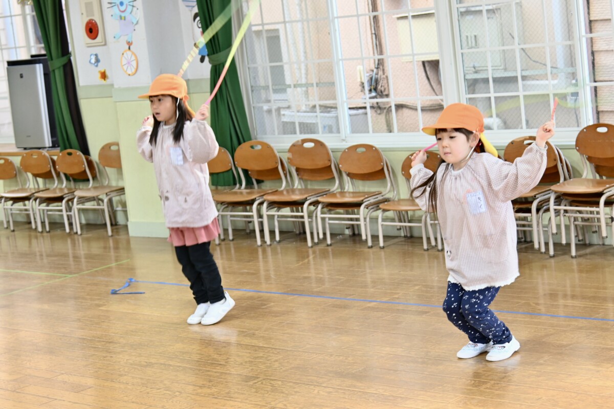 まずは年中組🎵年中組は、縄跳びで前跳び練習の真っ最中!!戸外遊びでも取り組んでいる子が多いので、連続で跳べる子もたくさん増えてきました。まだ連続では跳べない子も岡田先生にコツを教えてもらいながら挑戦していて、少しずつ上達目指して頑張っています☺️
