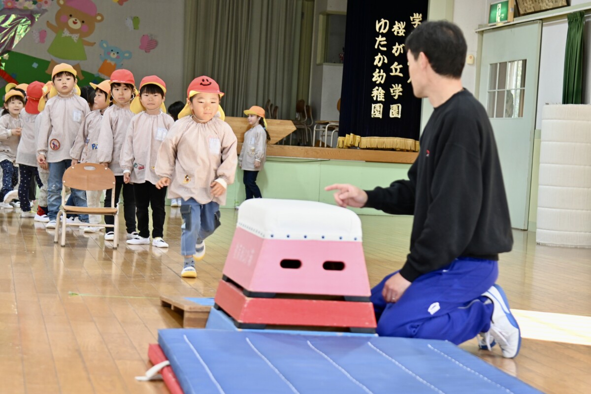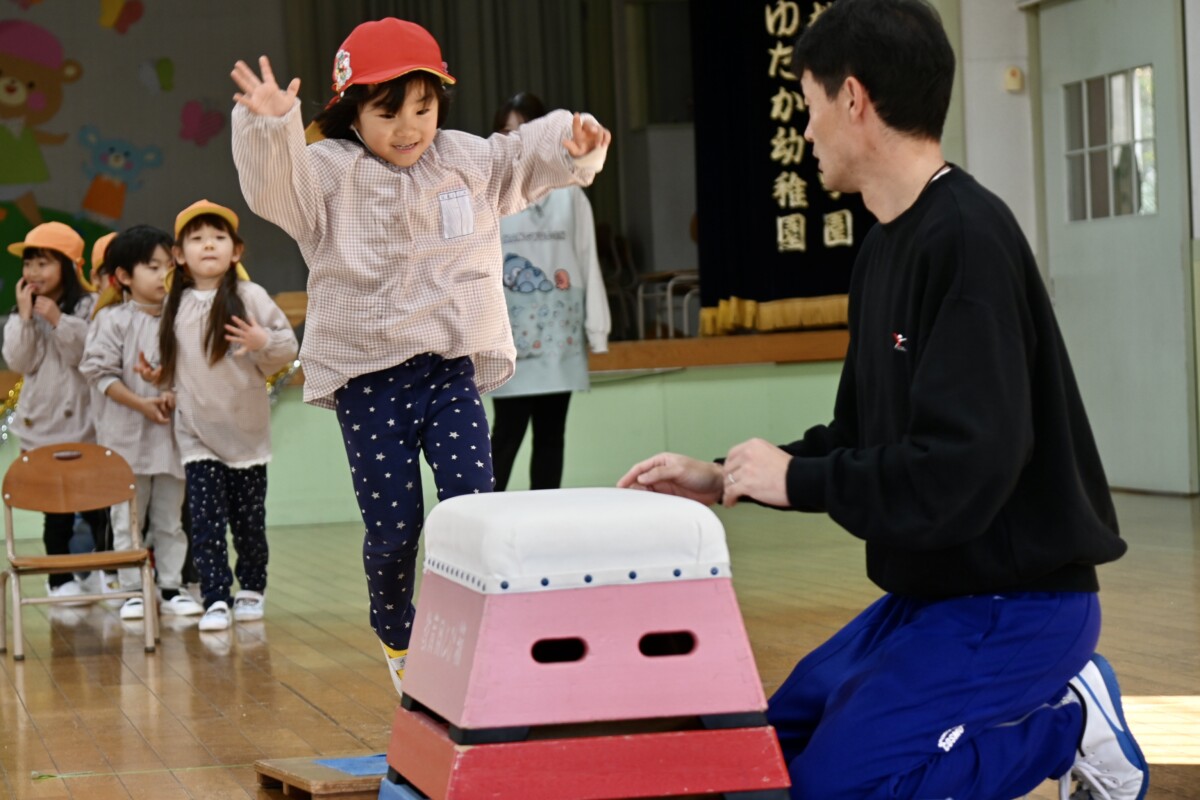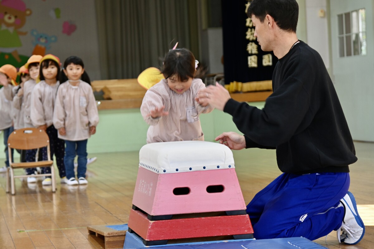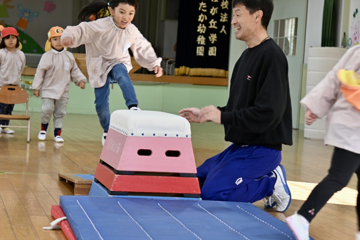 高さは2段と4段(写真では3段ですが、4段と同じ高さになってます)★どちらを選んで挑戦するかは自分で選んで取り組みます。うまくいかなくても大丈夫!先生たちがサポートしながら取り組みました😀👍