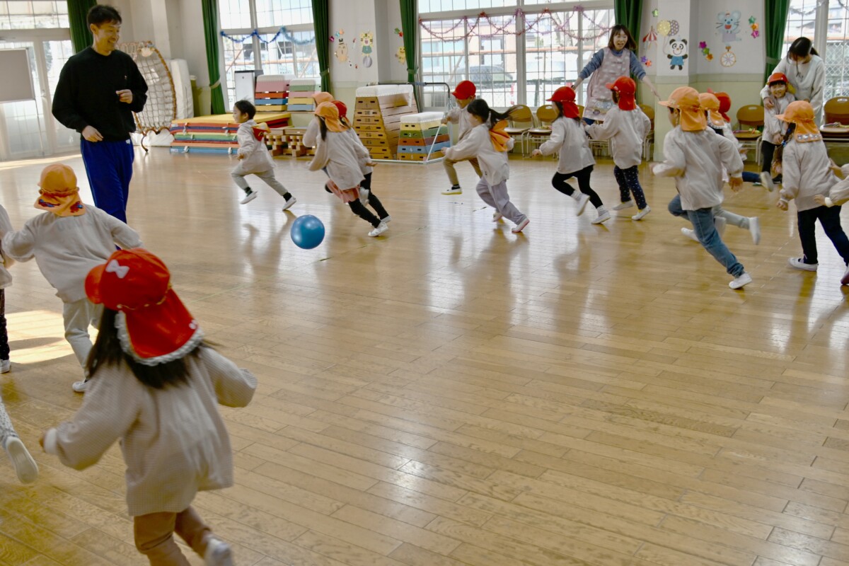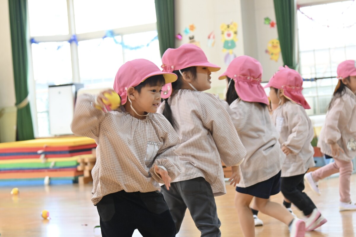 縄跳びの後は年少組もボール遊び🎾年少組は手のひらサイズのカラーボールを使って、片手で投げる動き🎵なるべく遠くに飛んでいくように、投げ方を岡田先生に教えてもらいながら取り組みました😀