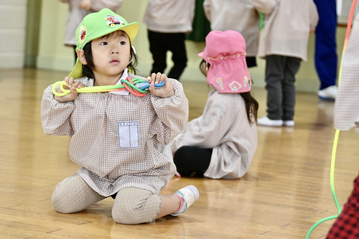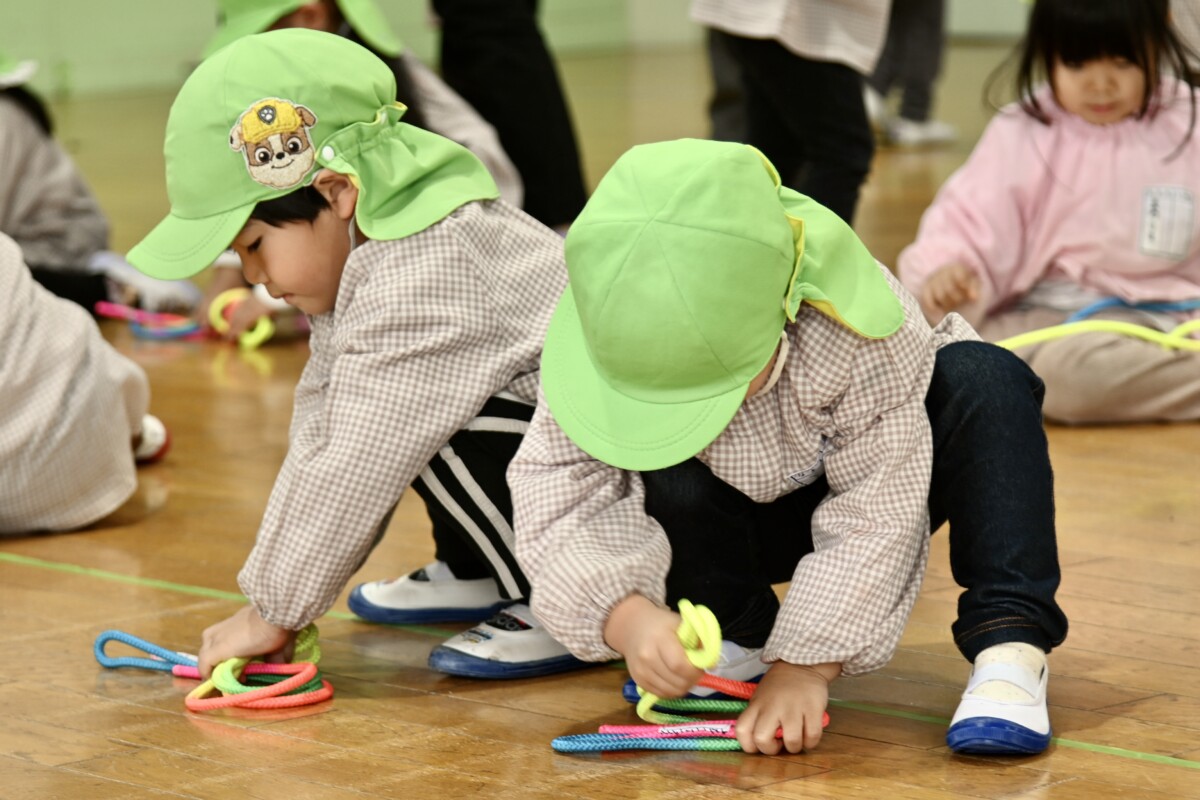 年少組も縄跳びに取り組んでいますが、年中組のようにはまだうまく跳べないので、まずは両足ジャンプや縄の持ち方、手首の回し方などから取り組みます★