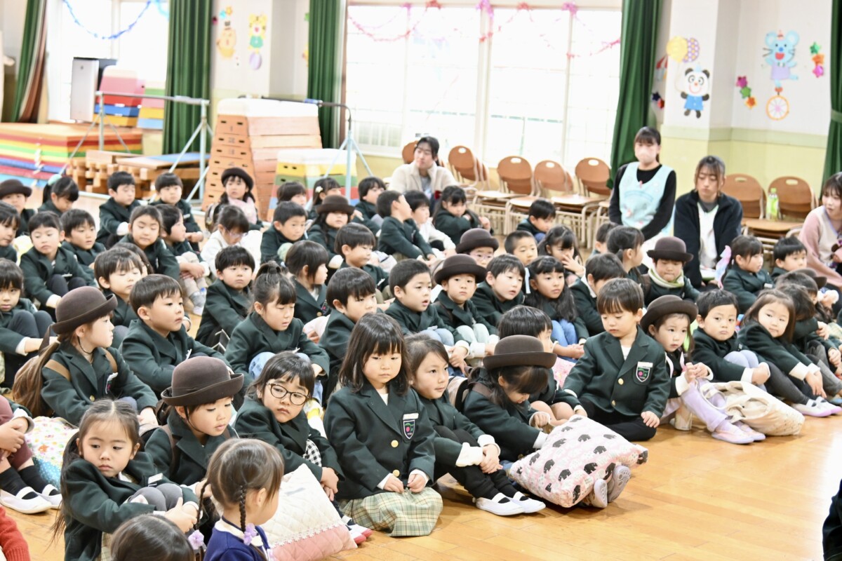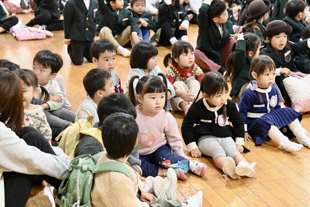 全園児ホールに集まって園長先生からのお話を聞きます。この2学期どんなことがあったかや、冬休みのお約束、3学期のお楽しみなど様々なお話を聞きました☺️