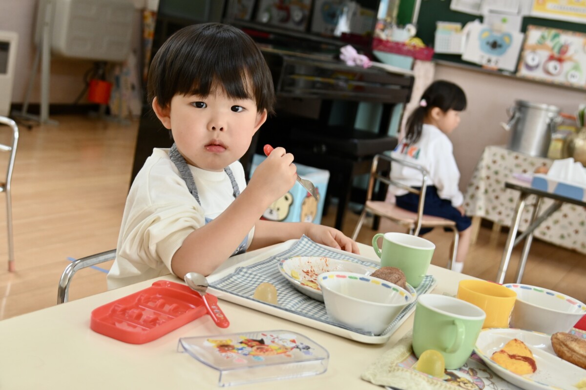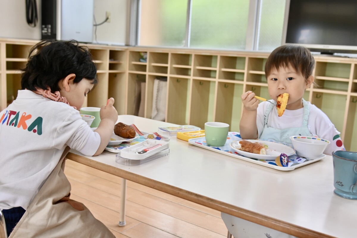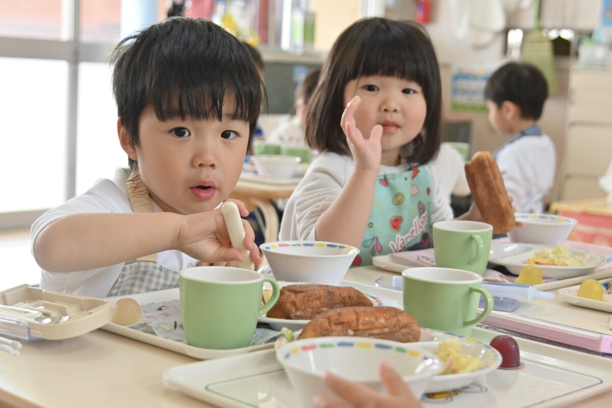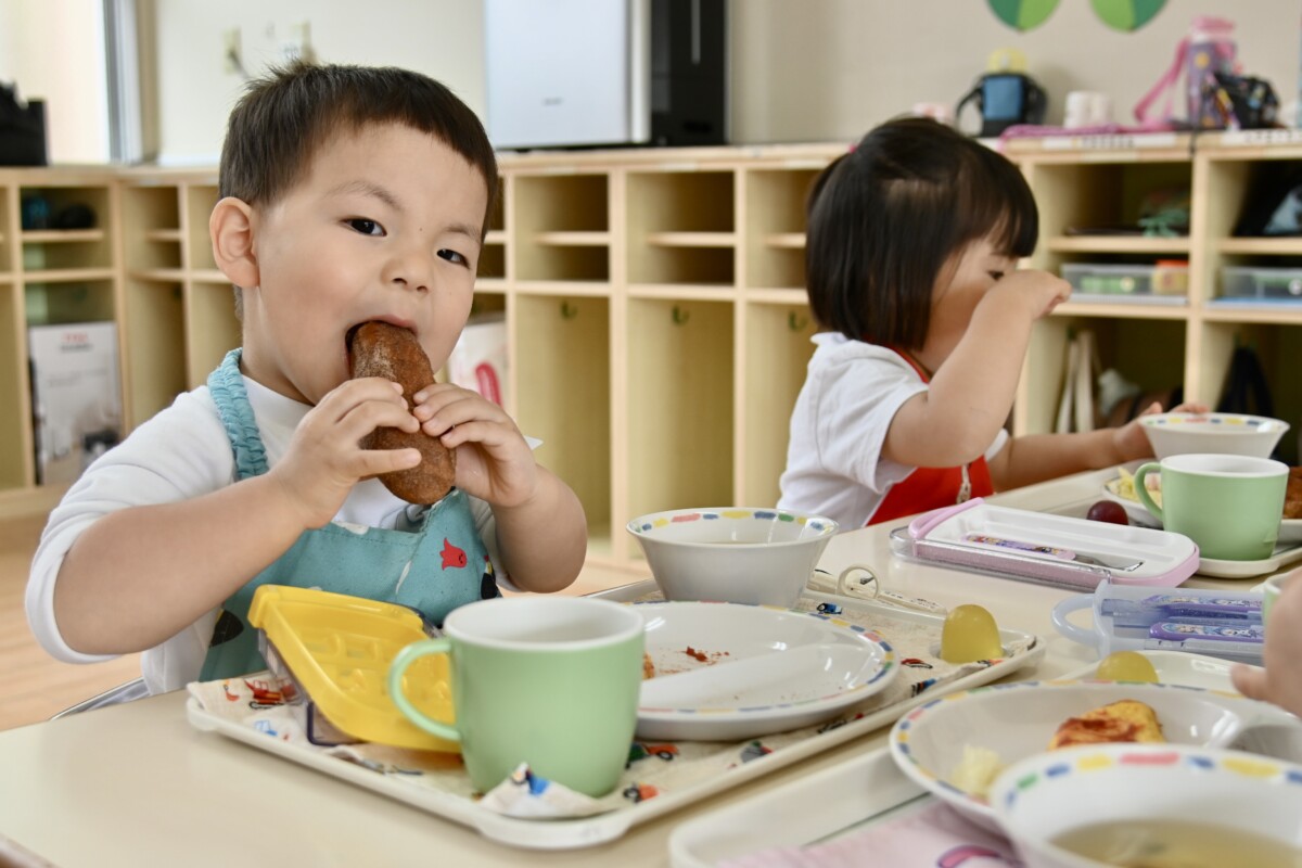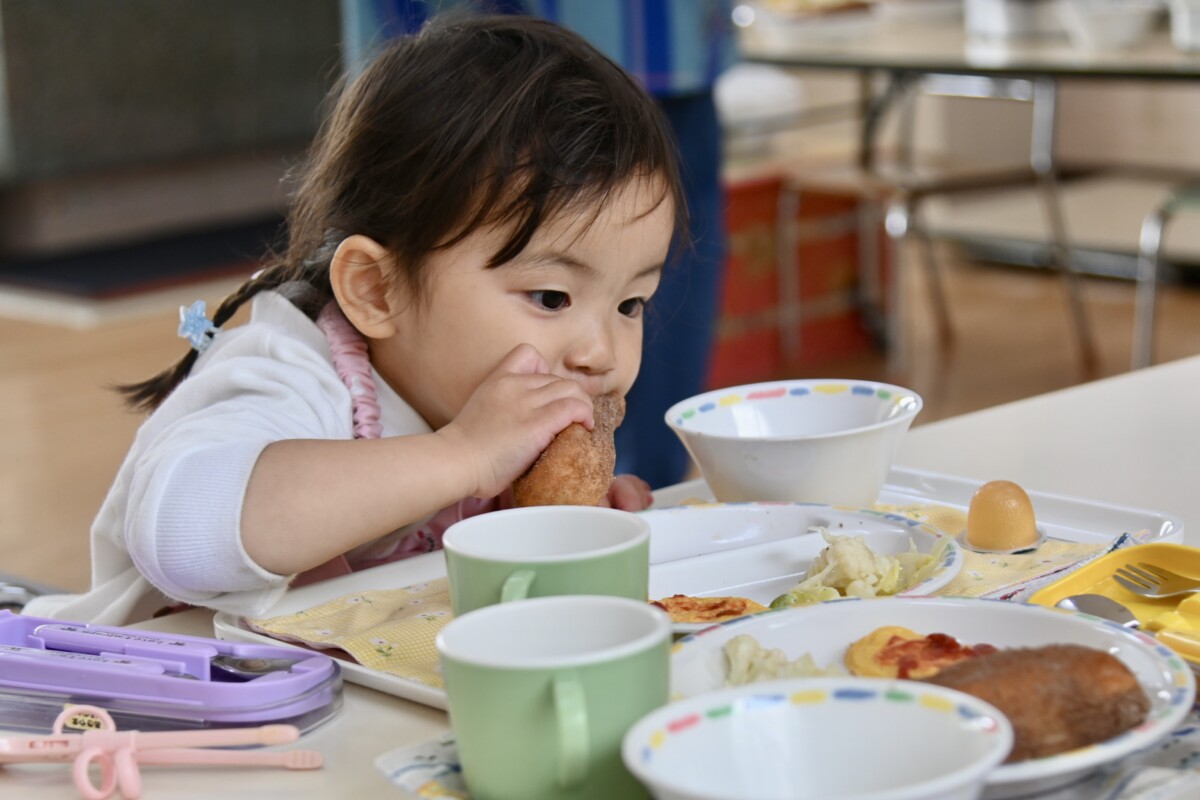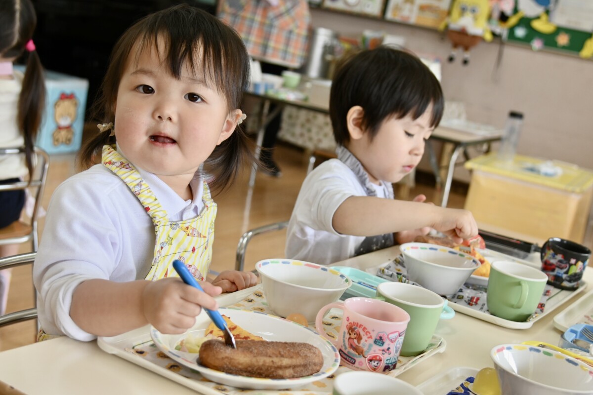 おいしいお給食🥖 2026.04.16 昨日からひよこ組も1日保育が始まりました⭐️ 昨日のお給食は、子どもたちに大人気の揚げパン💕美味しそうにお給食を食べる新入園児(年少・ひよこ組)のお友だちの様子を写真に収めましたので、少しですがご紹介します🎵 子どもたちが毎日食べているお給食の試食会は、5月の保育参観で行う予定ですのでお楽しみに😊 〜今日の給食〜