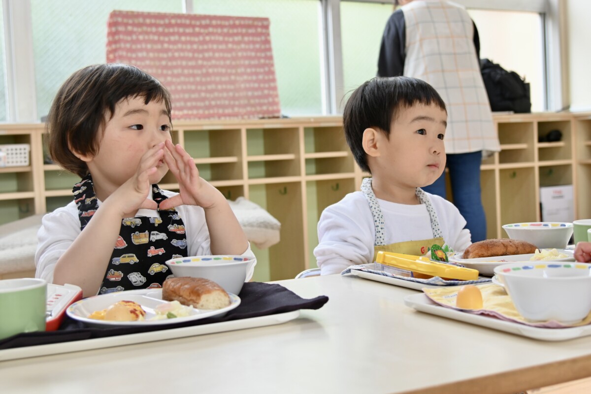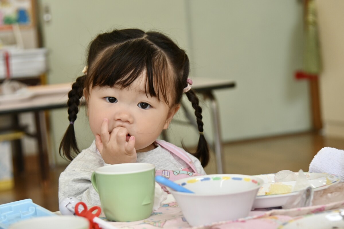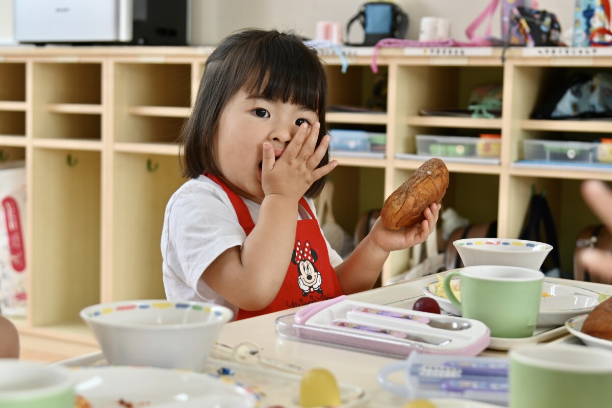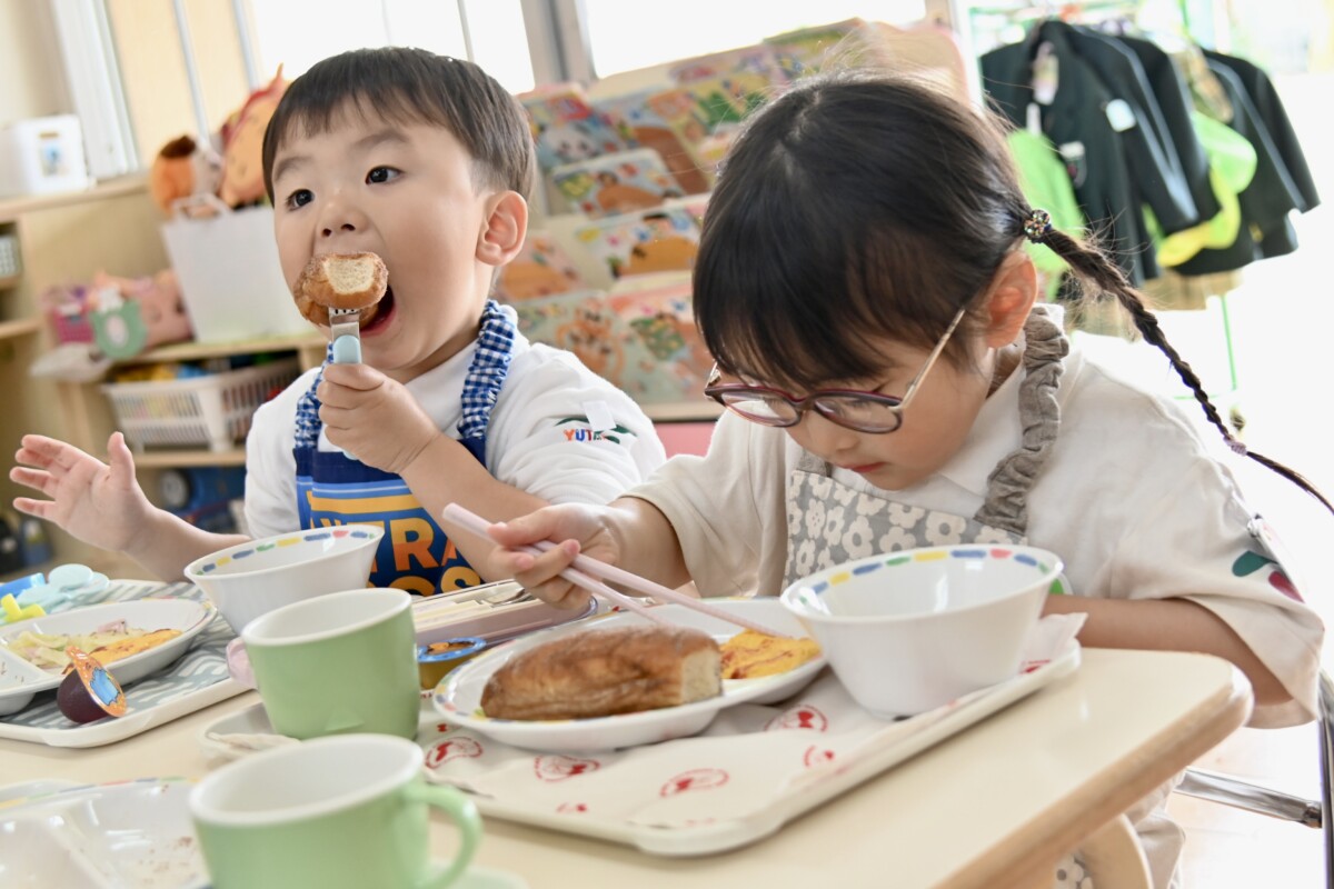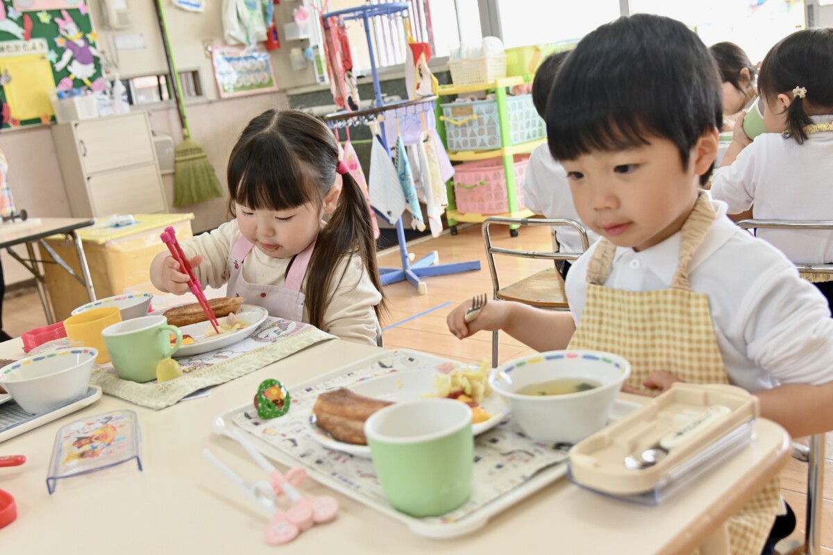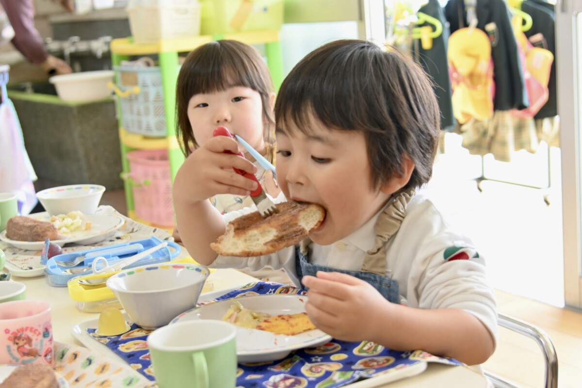 おいしいお給食🥖 2026.04.16 昨日からひよこ組も1日保育が始まりました⭐️ 昨日のお給食は、子どもたちに大人気の揚げパン💕美味しそうにお給食を食べる新入園児(年少・ひよこ組)のお友だちの様子を写真に収めましたので、少しですがご紹介します🎵 子どもたちが毎日食べているお給食の試食会は、5月の保育参観で行う予定ですのでお楽しみに😊 〜今日の給食〜