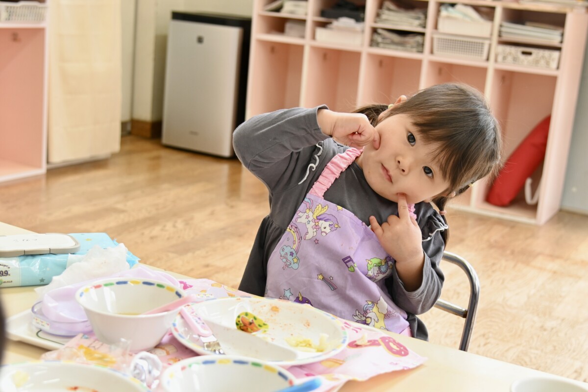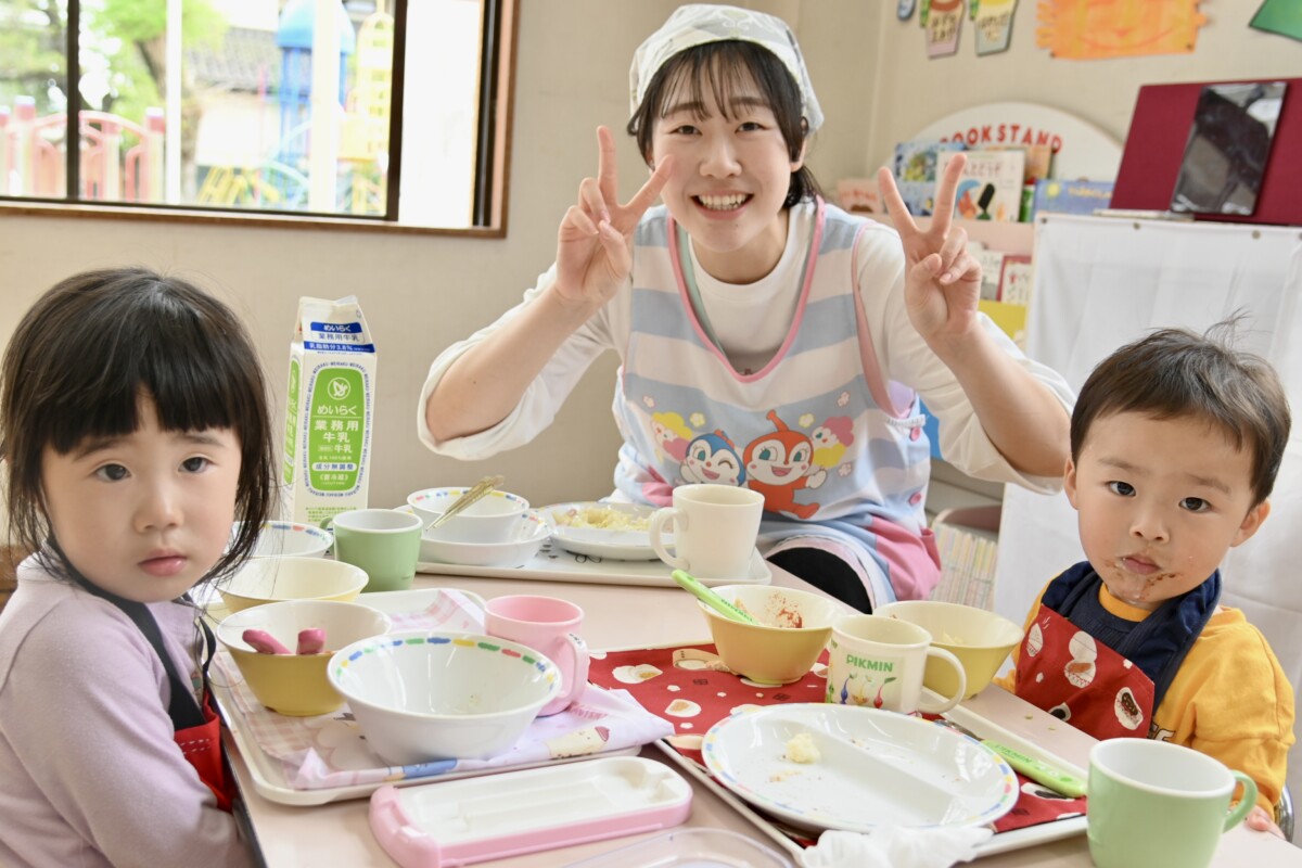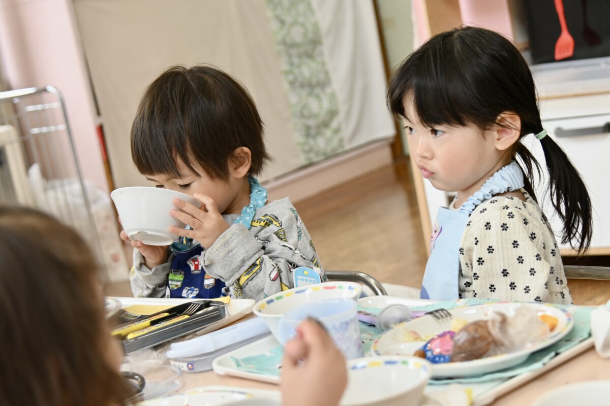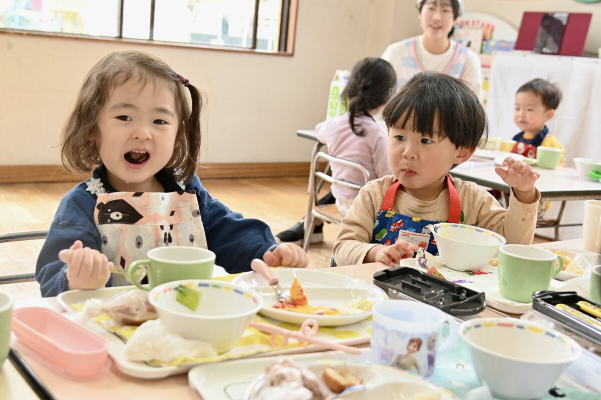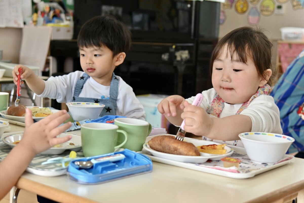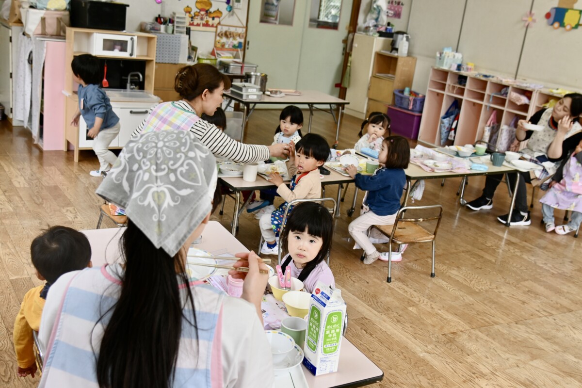 おいしいお給食🥖 2026.04.16 昨日からひよこ組も1日保育が始まりました⭐️ 昨日のお給食は、子どもたちに大人気の揚げパン💕美味しそうにお給食を食べる新入園児(年少・ひよこ組)のお友だちの様子を写真に収めましたので、少しですがご紹介します🎵 子どもたちが毎日食べているお給食の試食会は、5月の保育参観で行う予定ですのでお楽しみに😊 〜今日の給食〜
