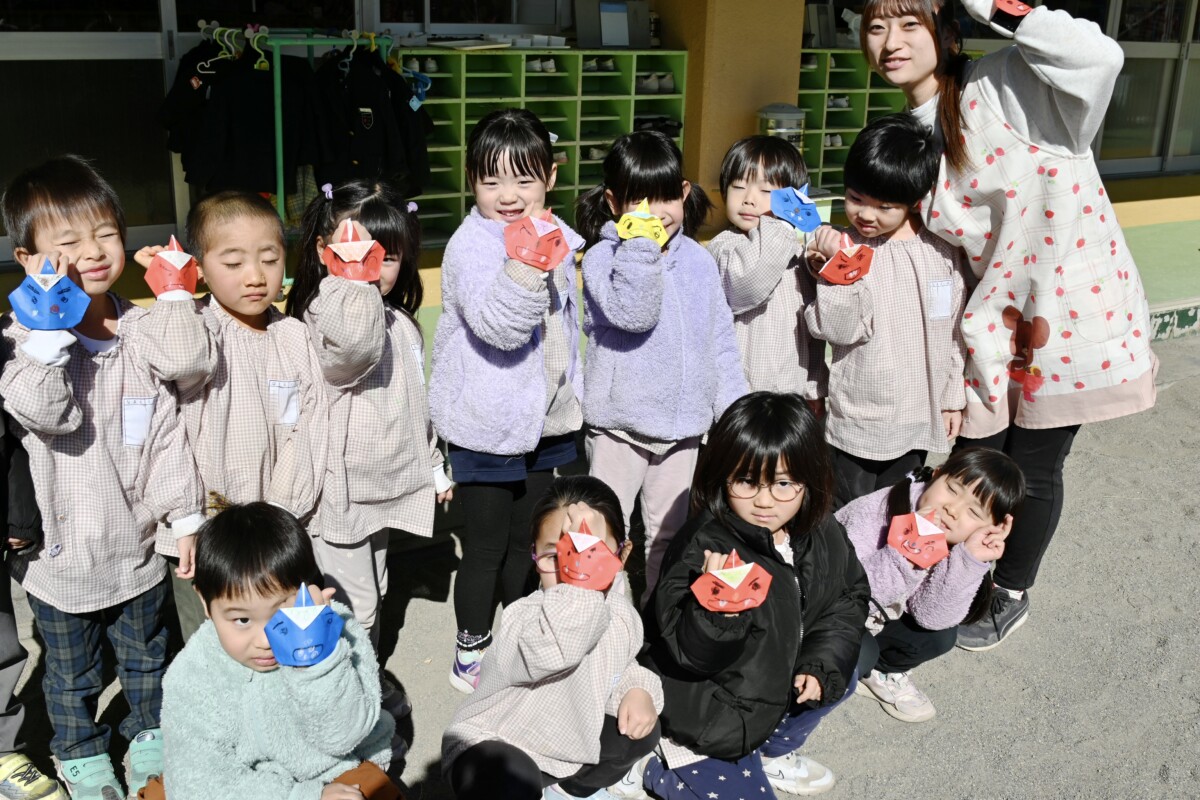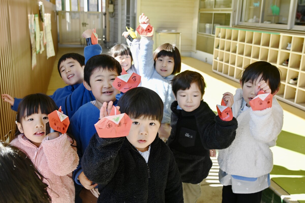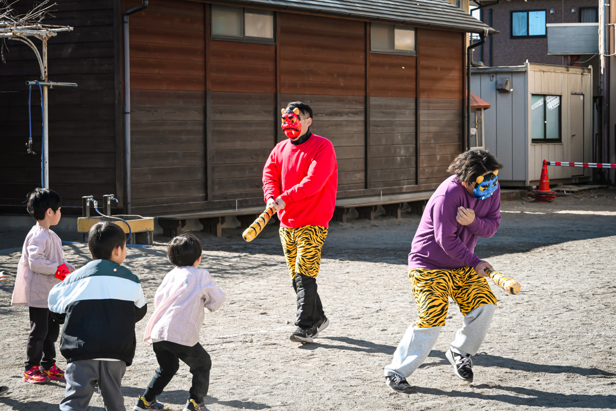 「鬼は外ー!福は内ー!!」と、子どもたちの元気いっぱいな掛け声が響き渡ります。怖いお面をつけている鬼たちですが、中身は優しい先生やお父さんたちなので、子どもたちの様子や学年に応じて対応はもちろん変えてくれています☺️ひよこ組さんなど小さいお友だちには優しく近寄ってくれていましたよ🎵