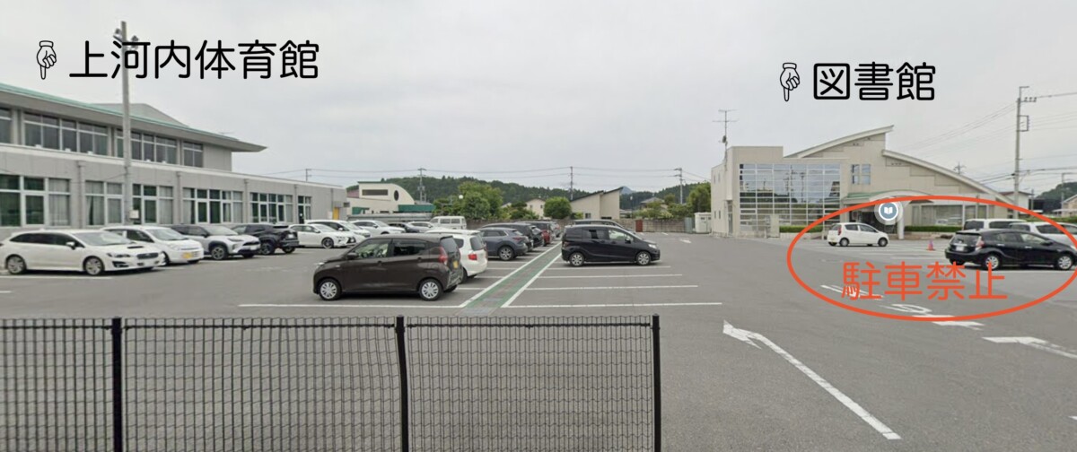 ・図書館前の駐車場・河内体育館正面入口前は駐車禁止です。