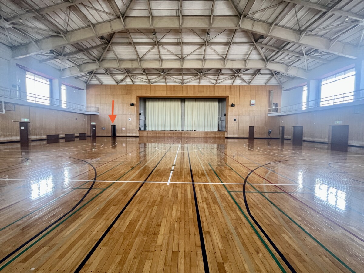 ・舞台が正面になります。舞台には椅子がありますが、スペースに限りがありますので、一家庭一席となります。入り口を入って左側を通り、舞台左横の入り口(↑矢印参照)から舞台へお上がりください。