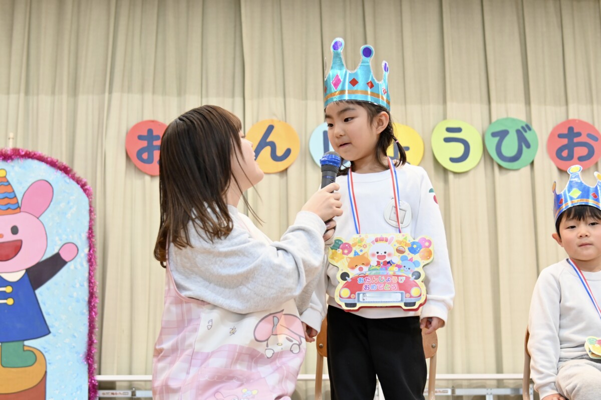 3月生まれのお友だちは4名⭐️これまでず〜っとお友だちのお誕生日会に参加し、今日のこの日をとても楽しみにしていたお友だちです☺️♡まずは園長先生からカードのプレゼントを首にかけてもらいます🎁