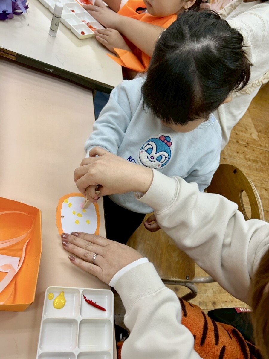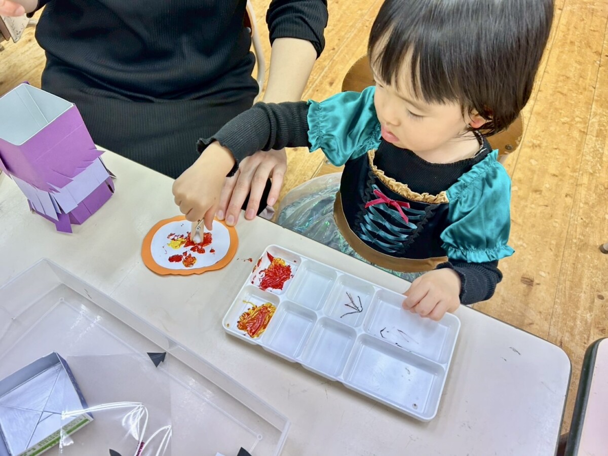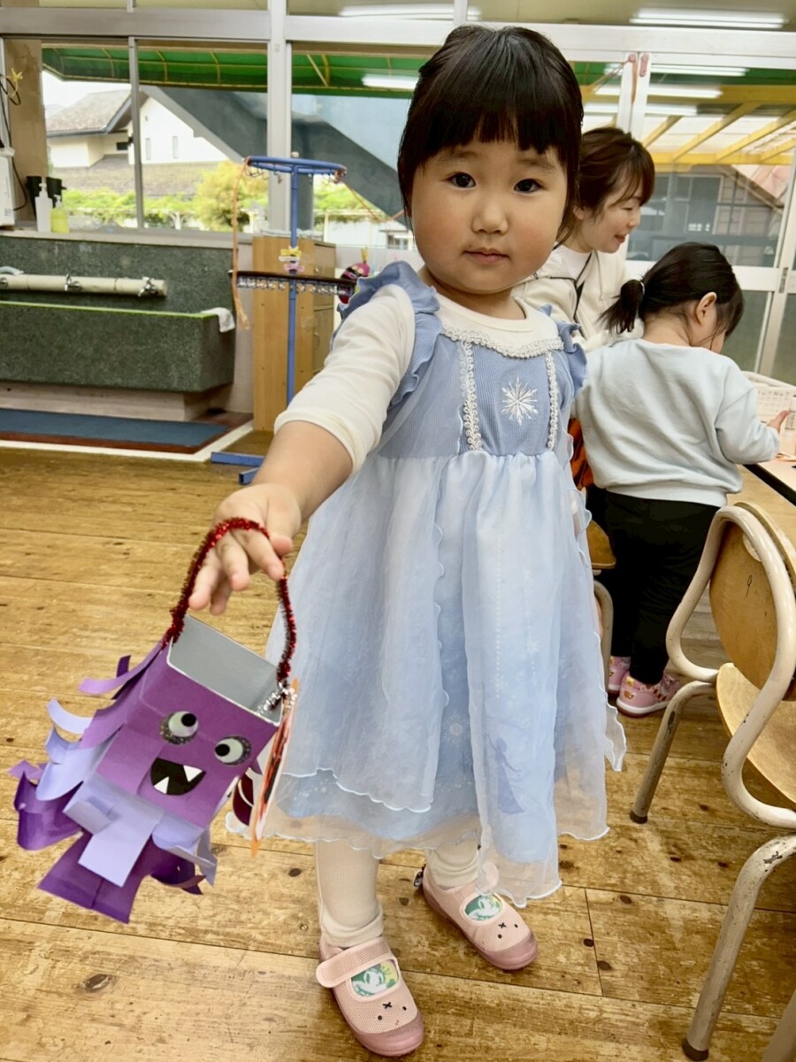 ↑この日はおうちの人も一緒に『ハロウィン制作』といことで、可愛い仮装をして登園してくれました🎃💕