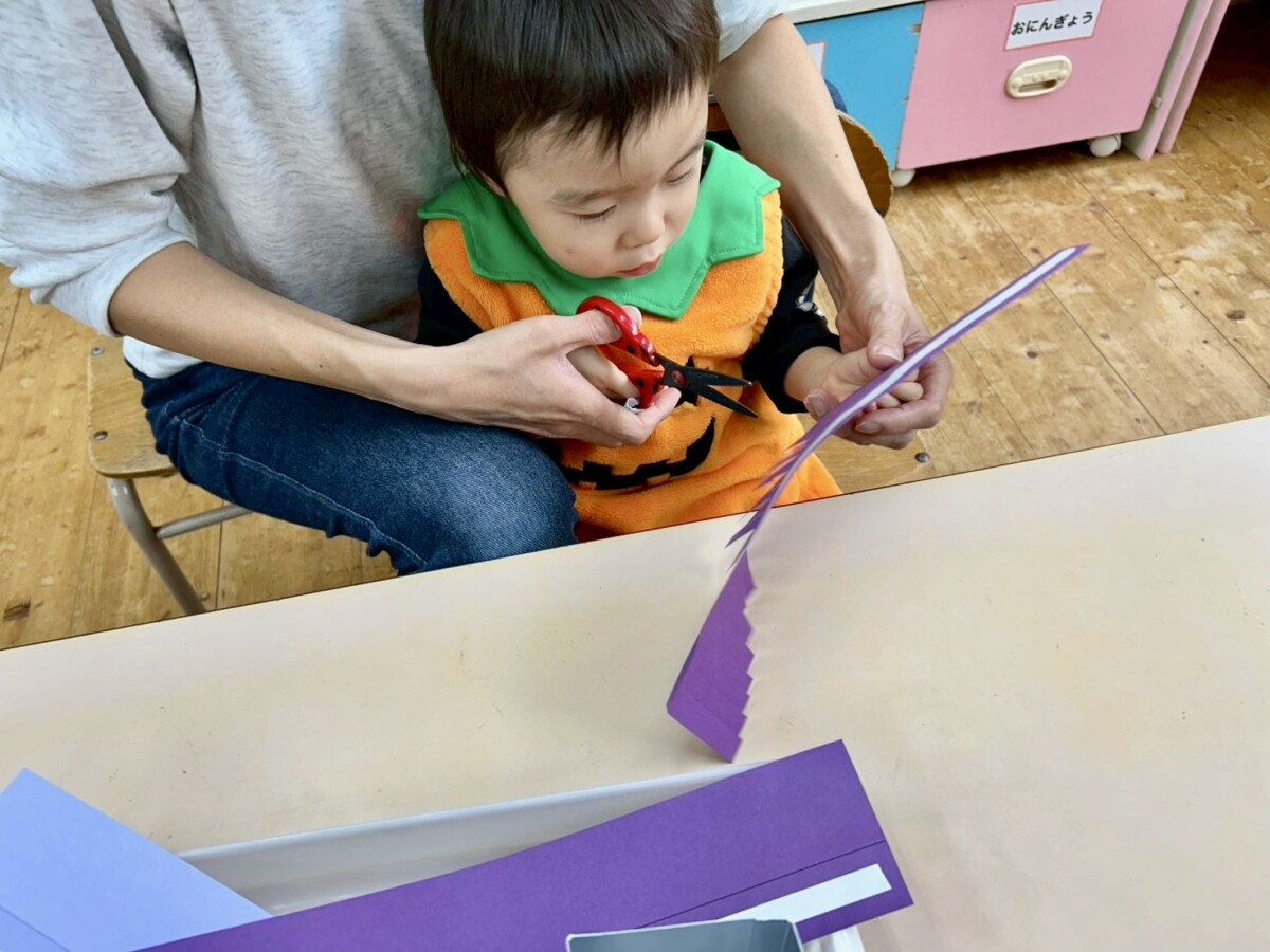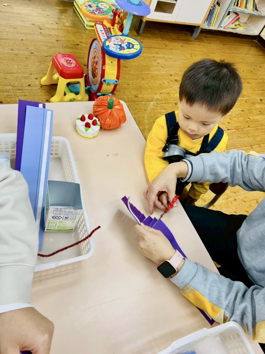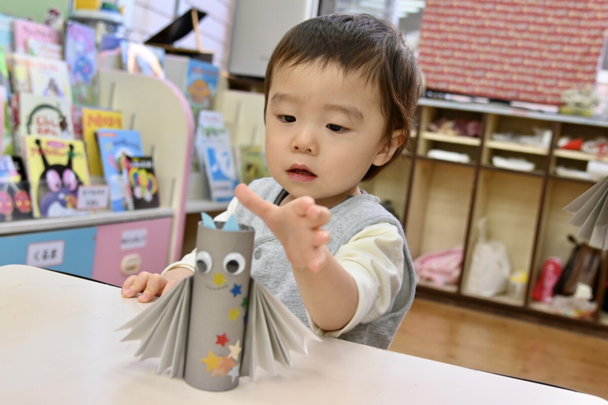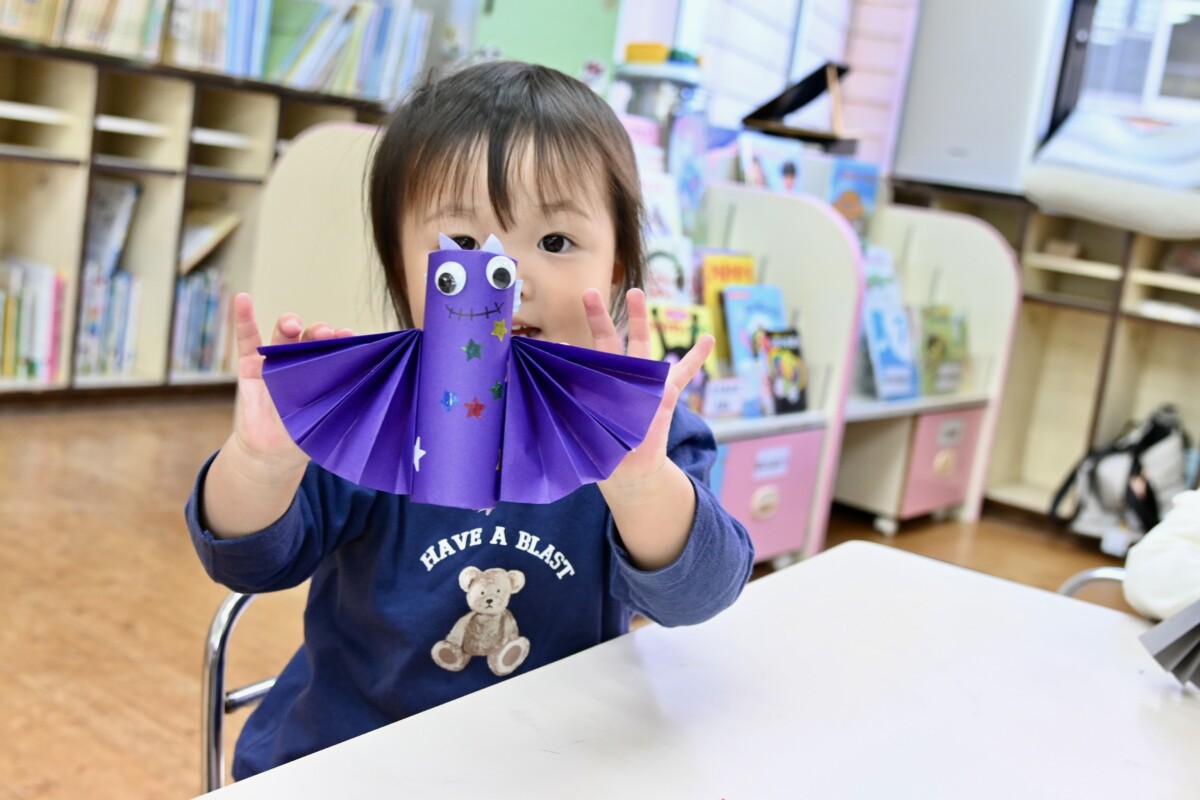 名前を呼ばれると「はーい!」と元気なお返事も聞かせてくれました☺️この日はハロウィン時期にちなんで『コウモリ制作』に挑戦★