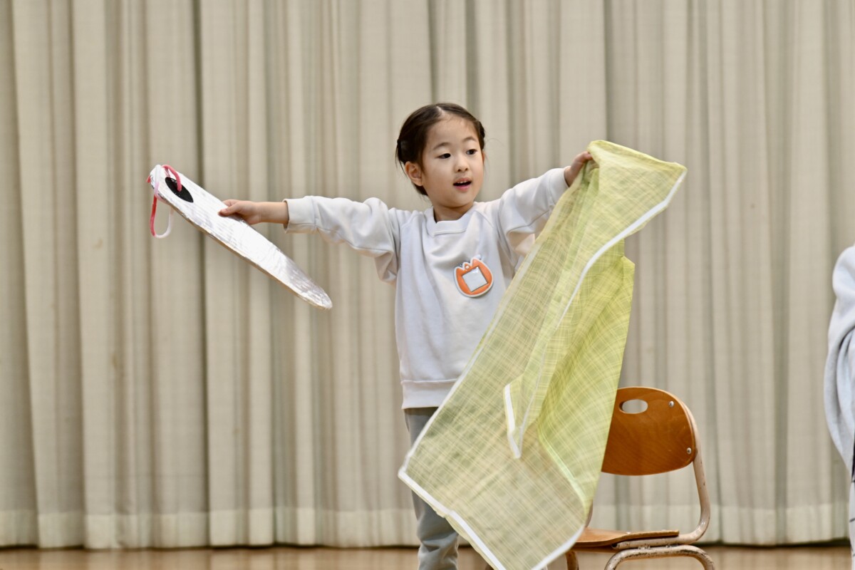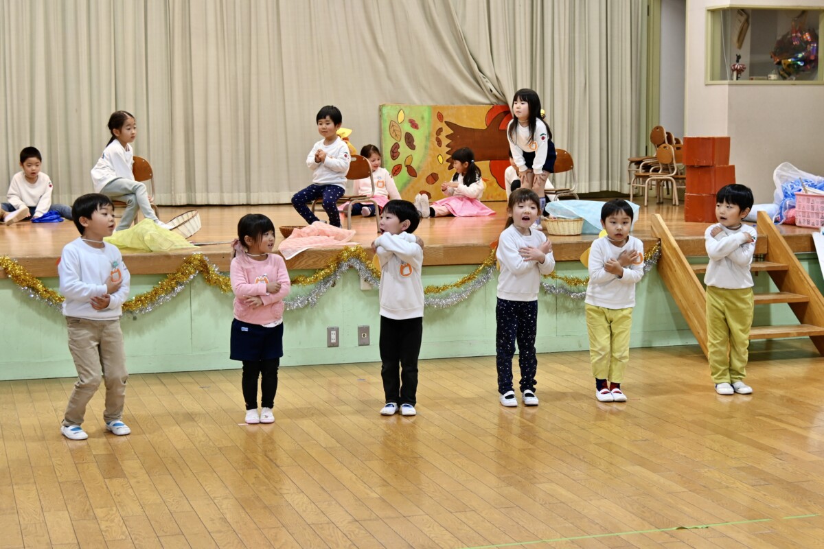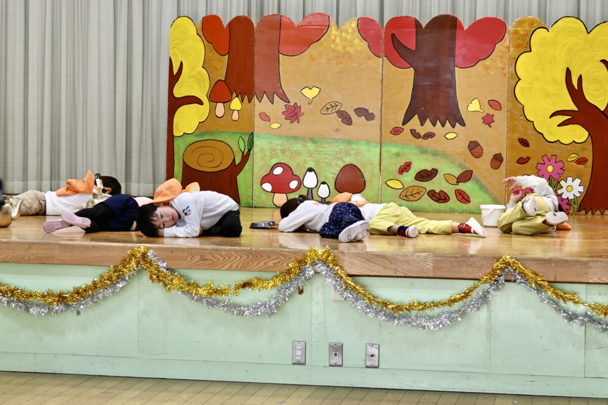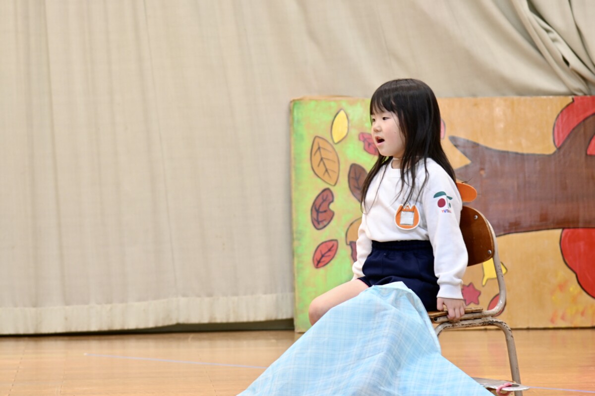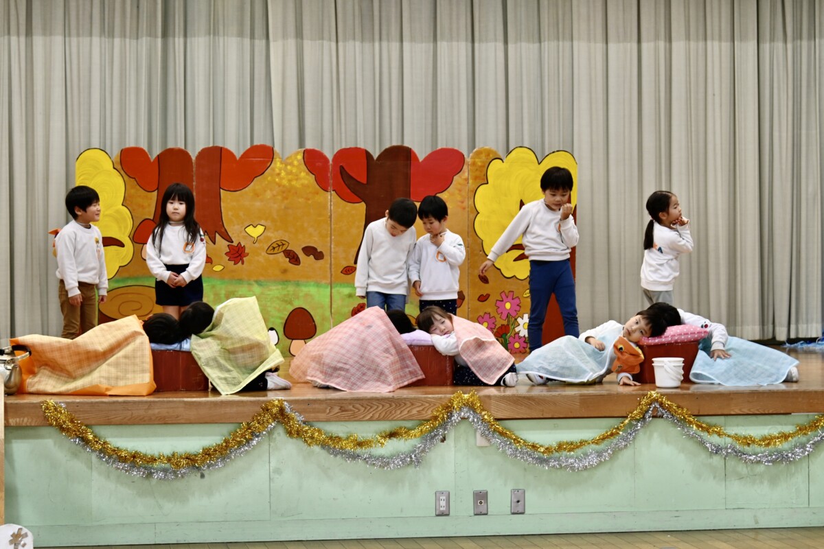 発表会で何を題材にするかは、担任の先生がその時のクラスの雰囲気や興味を持っているものなどを考慮した上で決めています。きく組は、夏ごろからカエルや昆虫に興味を持ち、保育室でも虫かごでカエルを飼育しているところから、この題材『ねむっちゃだめだよかえるくん』に決めたようです🐸子どもたちも興味を持っている題材なので、ストーリーにも親しみを持って練習に励む姿が見られています★