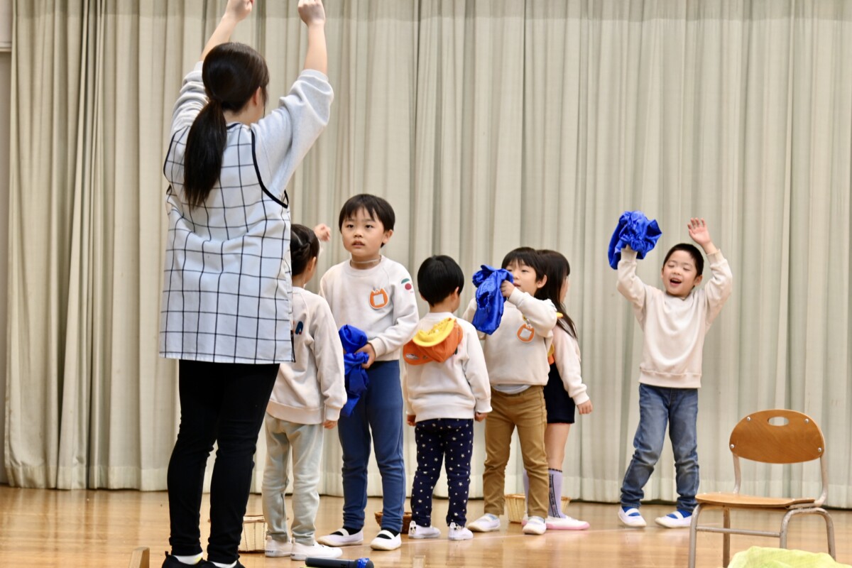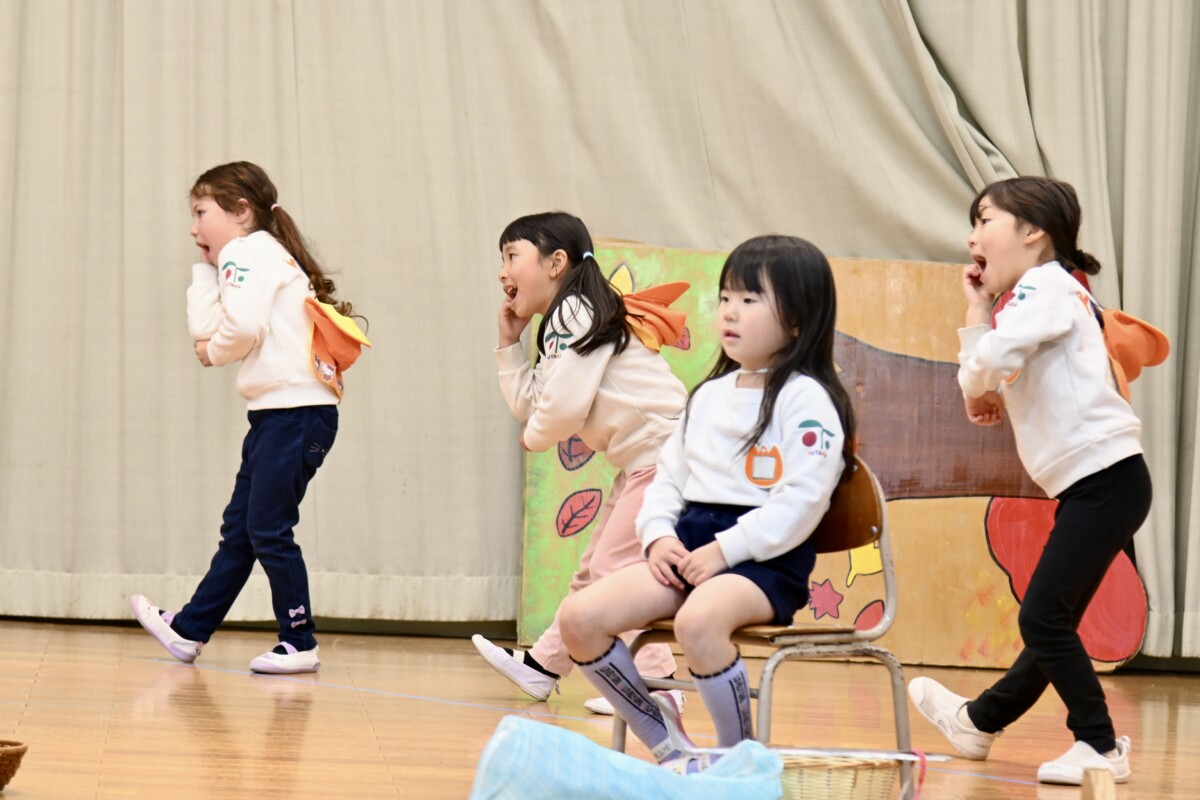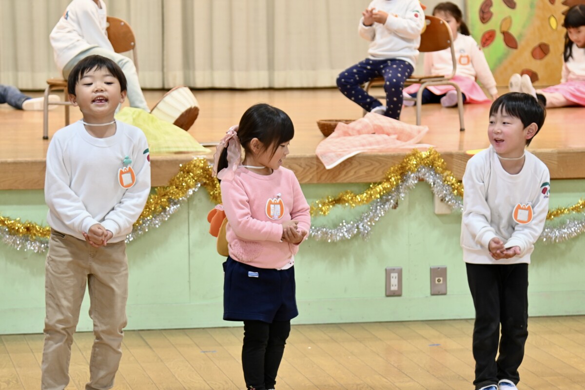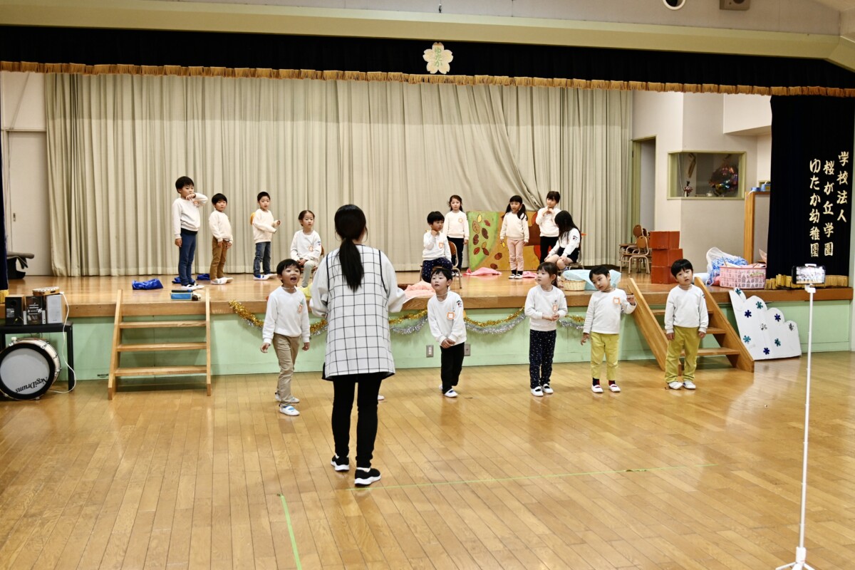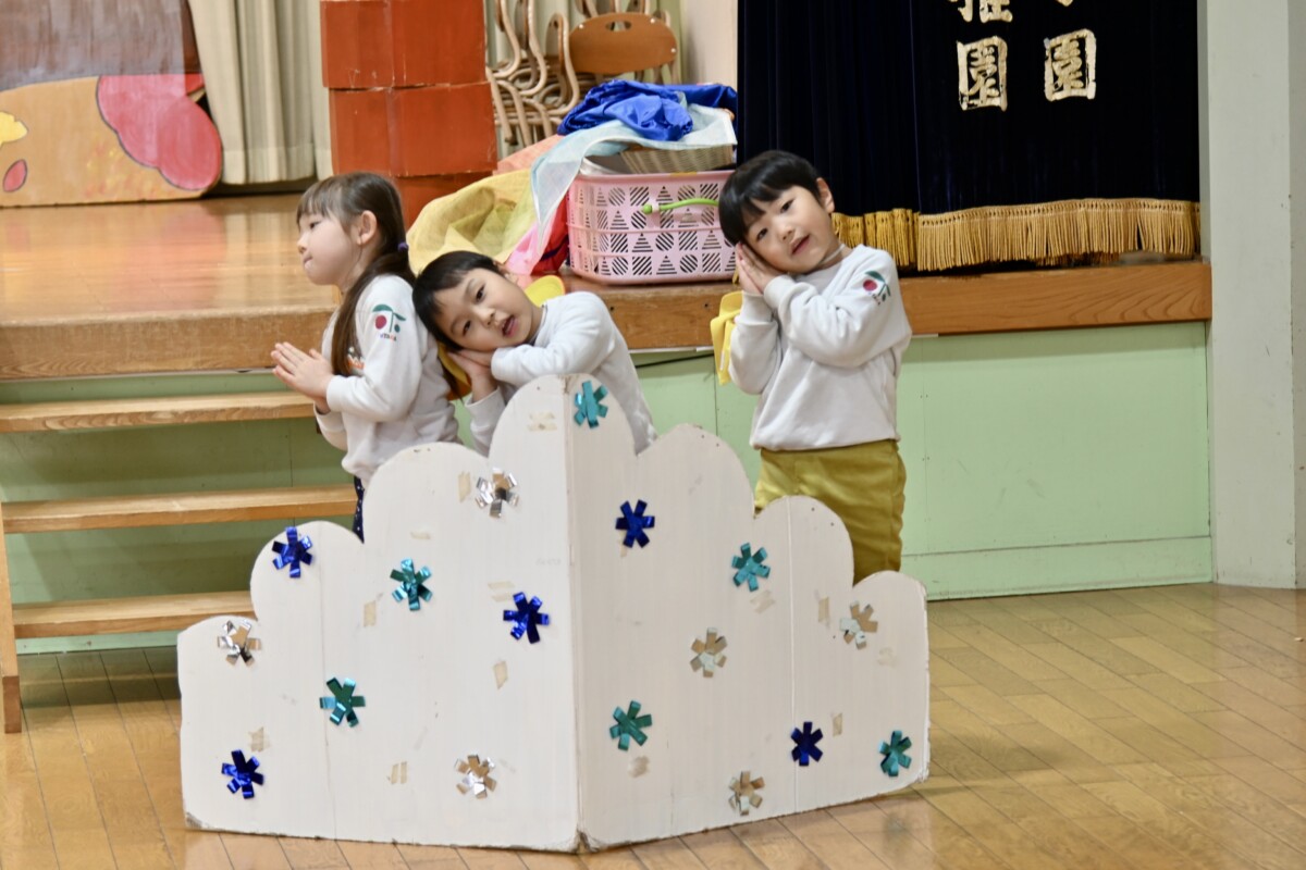 発表会で何を題材にするかは、担任の先生がその時のクラスの雰囲気や興味を持っているものなどを考慮した上で決めています。きく組は、夏ごろからカエルや昆虫に興味を持ち、保育室でも虫かごでカエルを飼育しているところから、この題材『ねむっちゃだめだよかえるくん』に決めたようです🐸子どもたちも興味を持っている題材なので、ストーリーにも親しみを持って練習に励む姿が見られています★