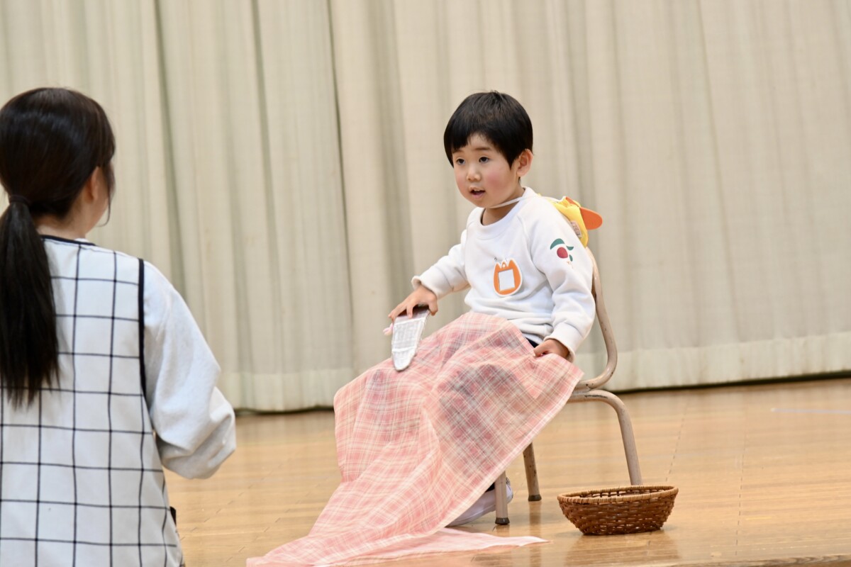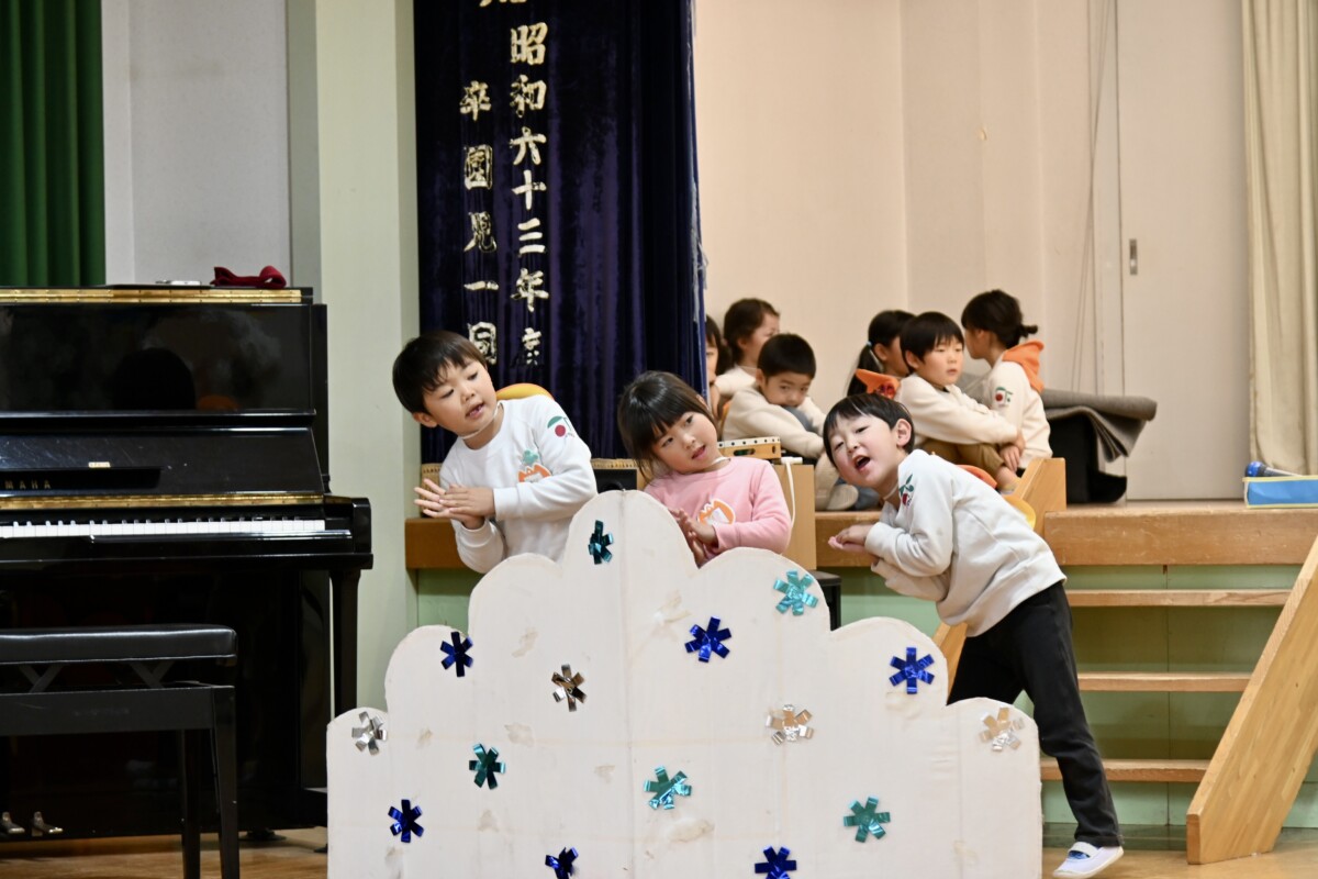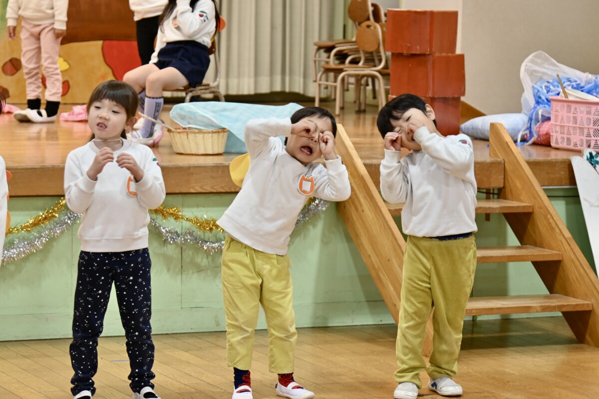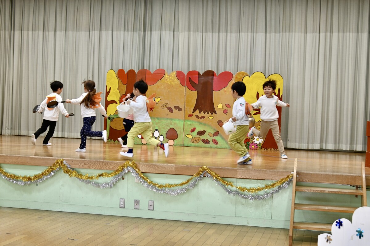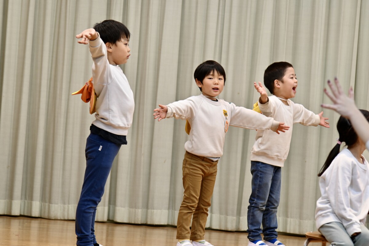 発表会で何を題材にするかは、担任の先生がその時のクラスの雰囲気や興味を持っているものなどを考慮した上で決めています。きく組は、夏ごろからカエルや昆虫に興味を持ち、保育室でも虫かごでカエルを飼育しているところから、この題材『ねむっちゃだめだよかえるくん』に決めたようです🐸子どもたちも興味を持っている題材なので、ストーリーにも親しみを持って練習に励む姿が見られています★
