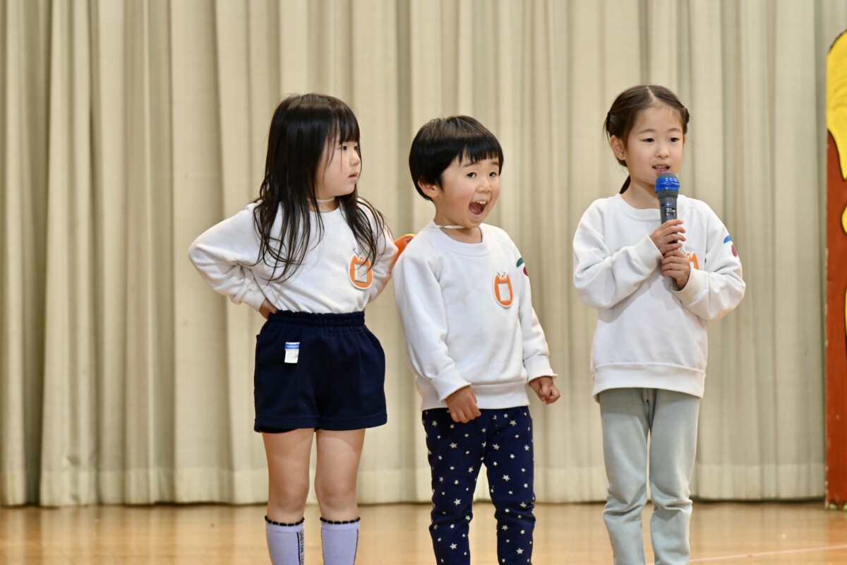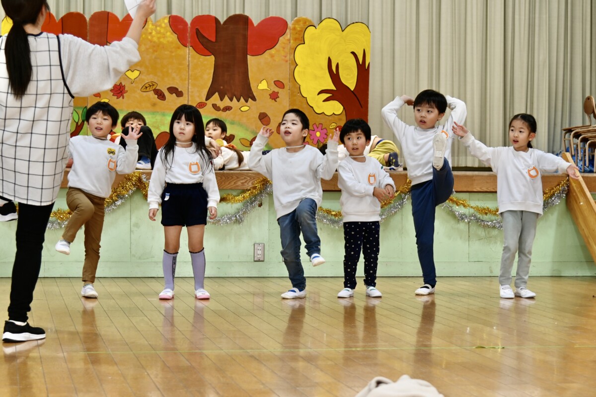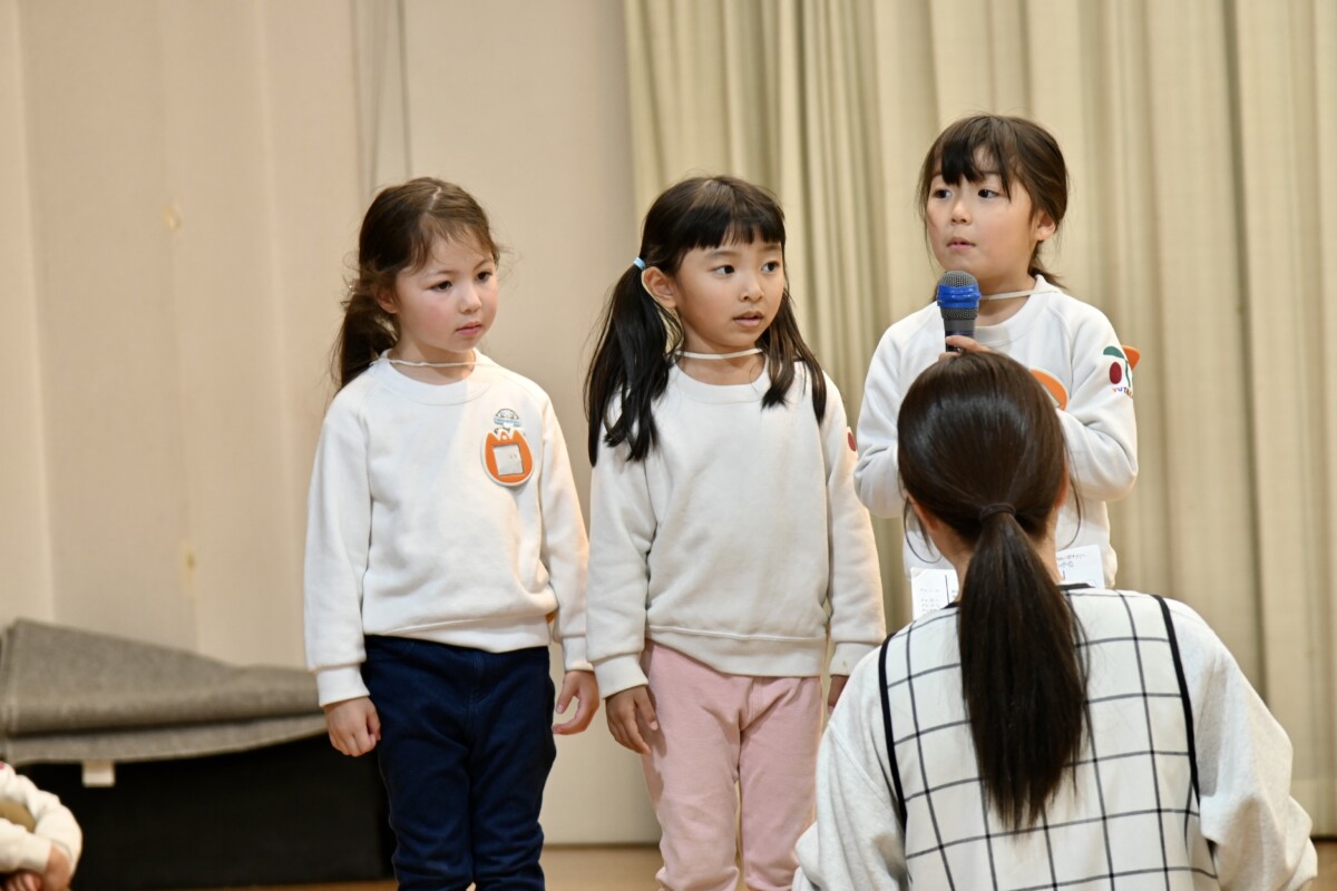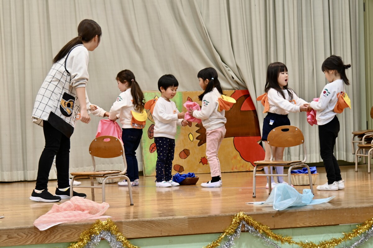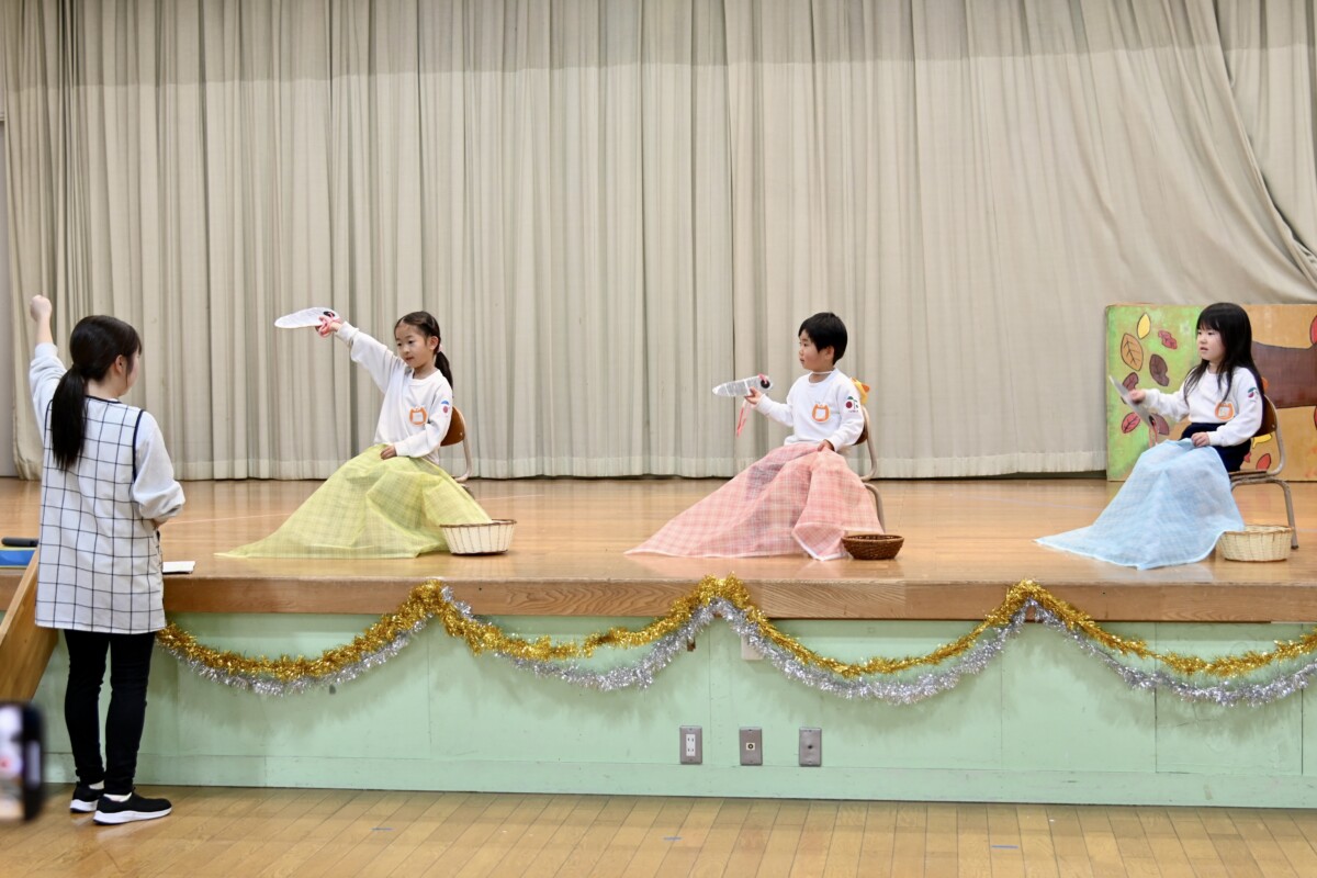 発表会で何を題材にするかは、担任の先生がその時のクラスの雰囲気や興味を持っているものなどを考慮した上で決めています。きく組は、夏ごろからカエルや昆虫に興味を持ち、保育室でも虫かごでカエルを飼育しているところから、この題材『ねむっちゃだめだよかえるくん』に決めたようです🐸子どもたちも興味を持っている題材なので、ストーリーにも親しみを持って練習に励む姿が見られています★