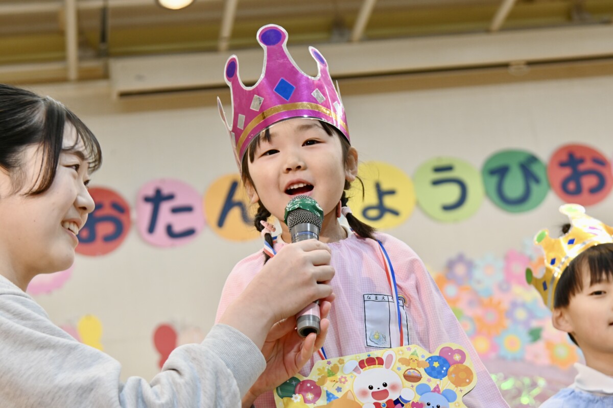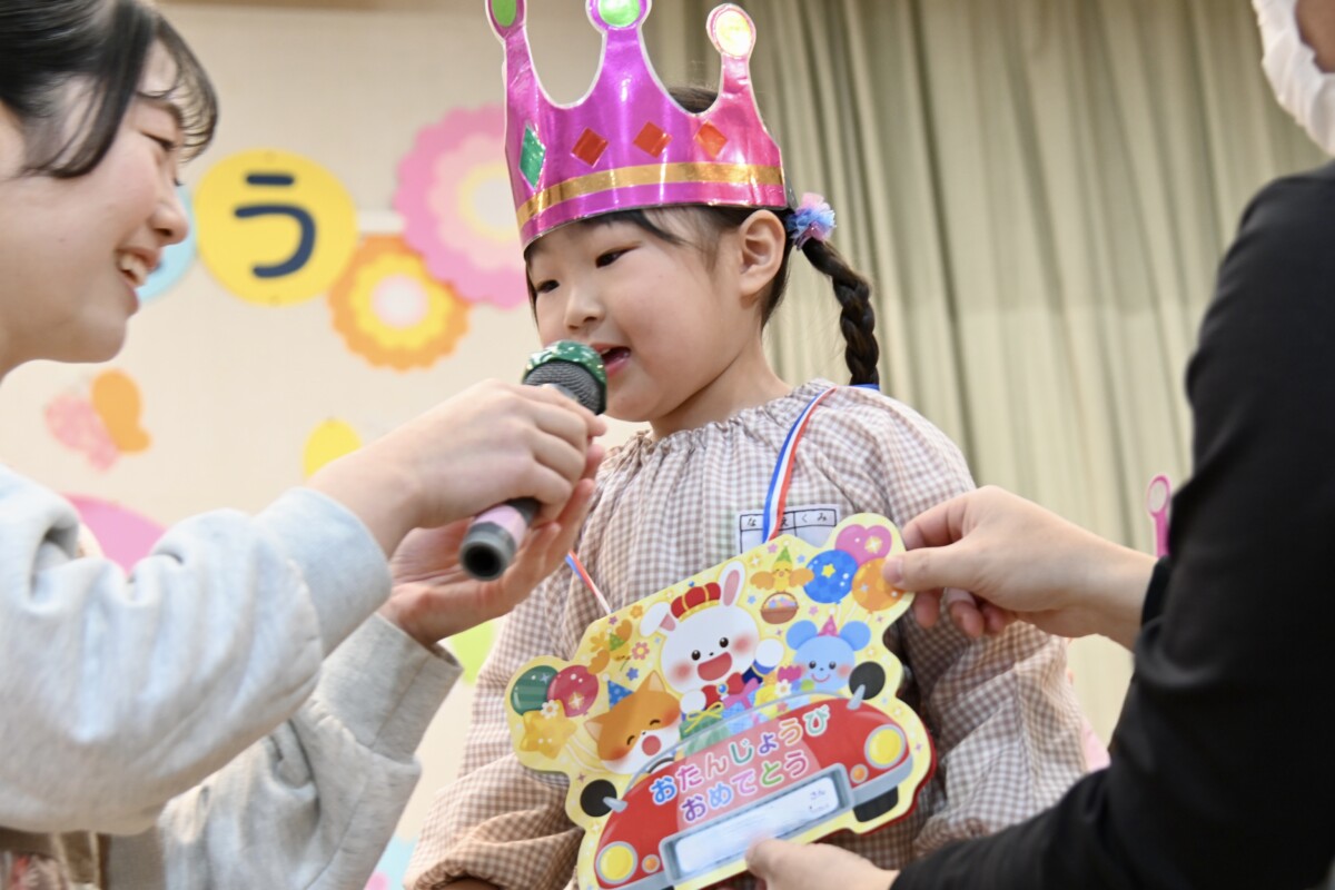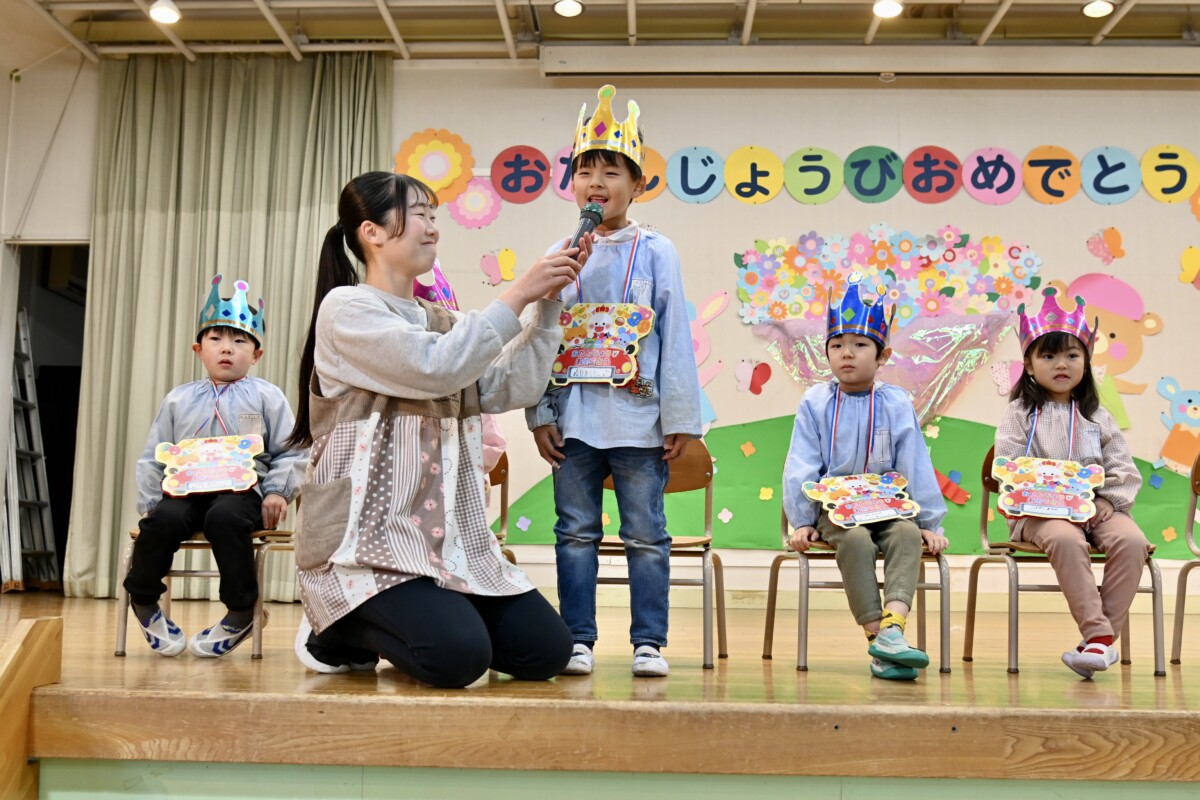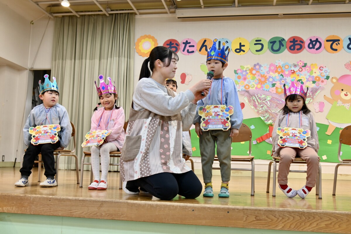 今日は2月生まれのお誕生日会を開催しました💝舞台に登った今日の主役は10名のお友だち🎵まずは園長先生からバースデーカードのプレゼントを首にかけてもらいます。今月誕生日を迎えるお友だち、自分の名前やお礼の言葉をしっかり言うことができていました✨