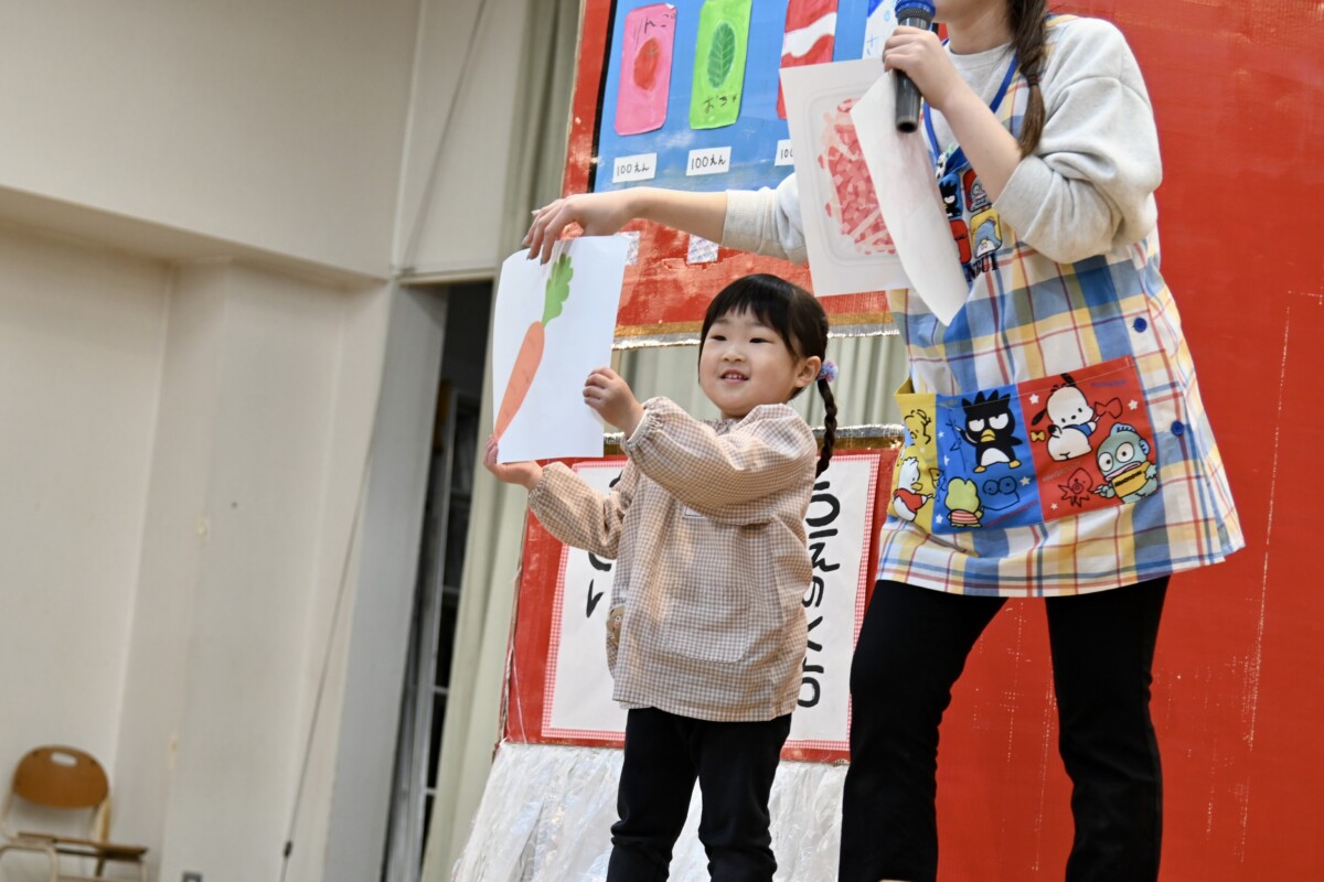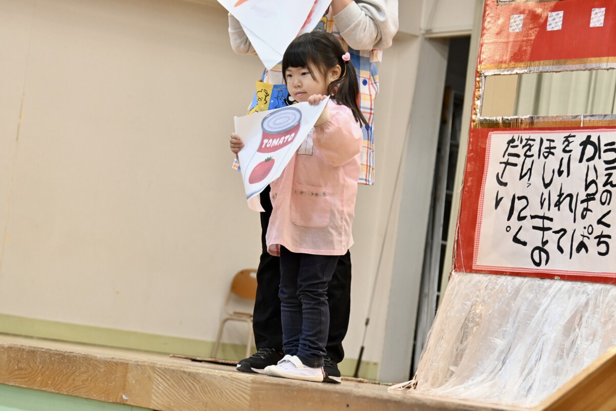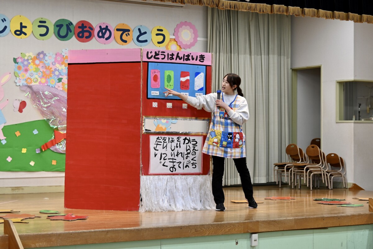 2月お誕生日のお友だちがみんなを代表して舞台に登り、自動販売機に葉っぱを入れてみます🌱すると下の口から、いろんな具材が出てきました⭐️