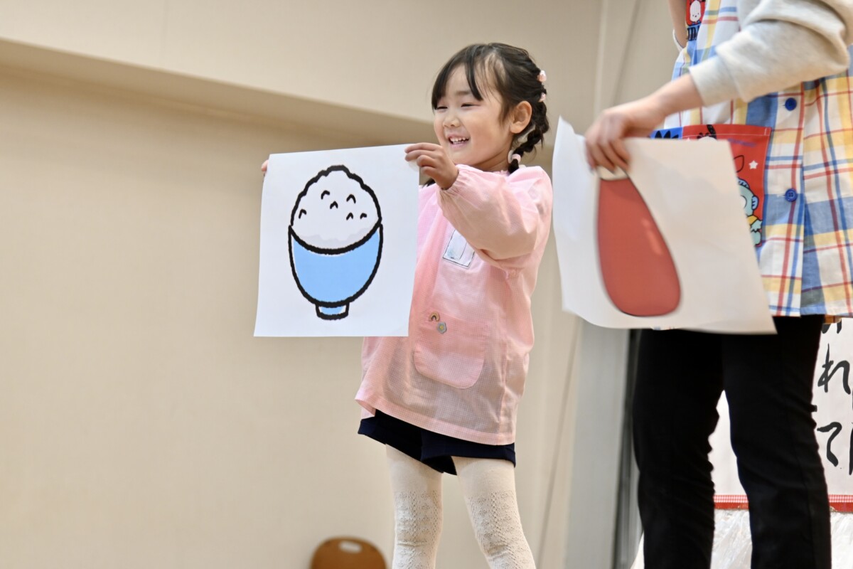 出てきた食材を混ぜると何ができるかみんなで考えるクイズ形式⭐️何が出てくるかのワクワク感を感じながら、出てきた食材で何ができるかお友だちや先生と一緒に考えたり、みんなで楽しく参加しました♡最後には、今日のお給食で出るスパゲッティやお誕生日のお友だちに向けたケーキなども出てきました💕