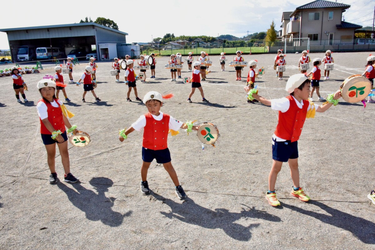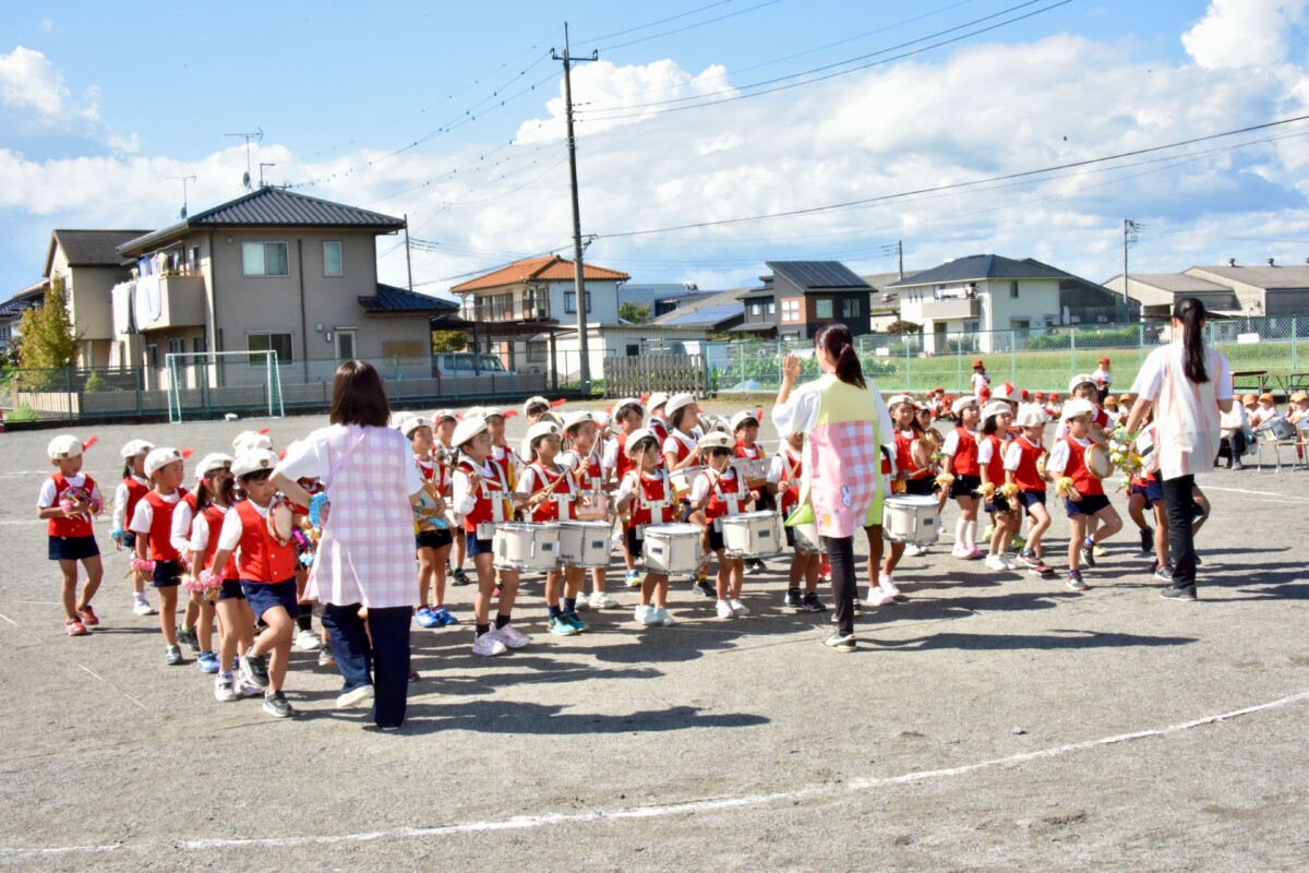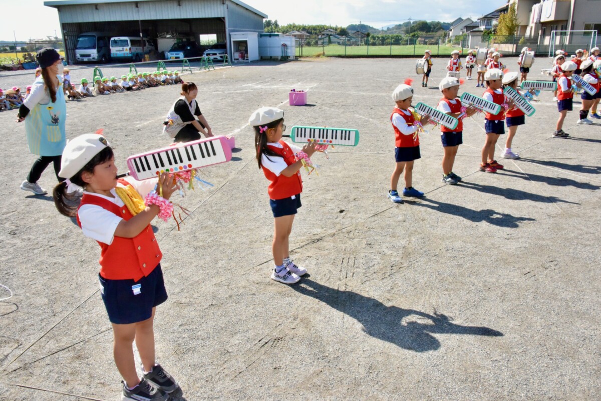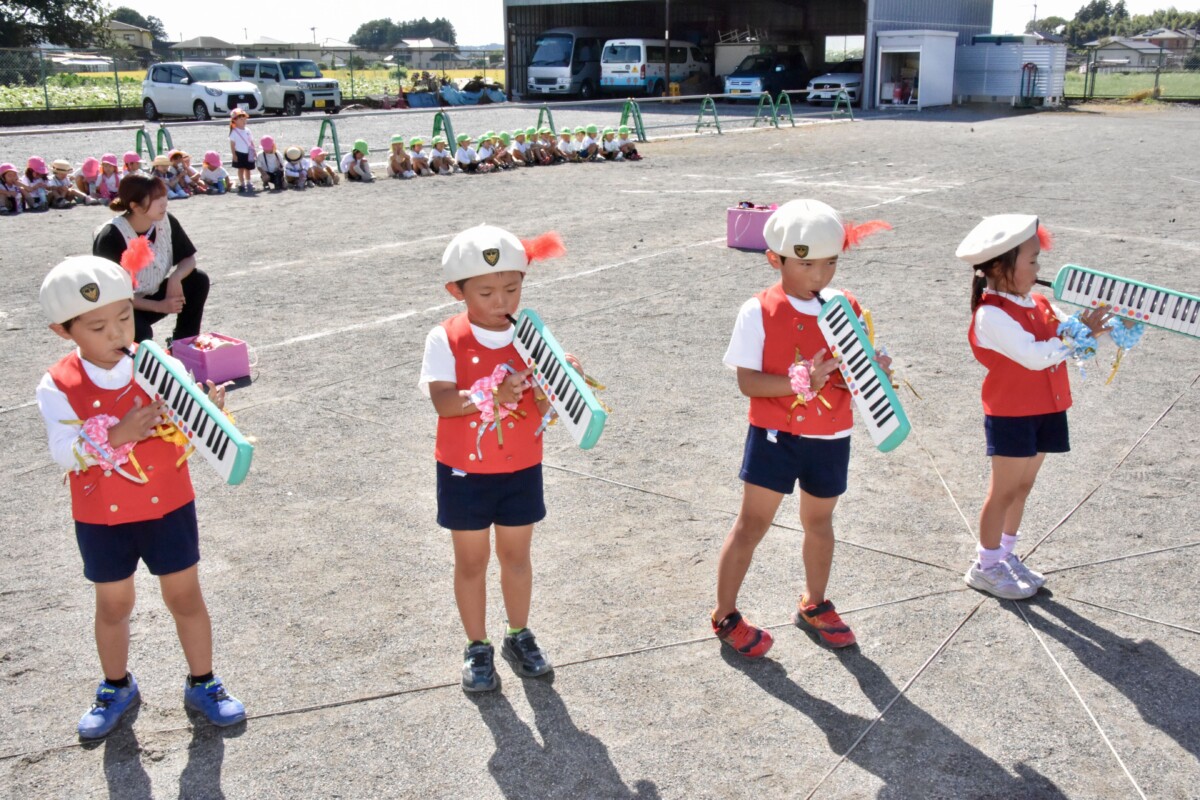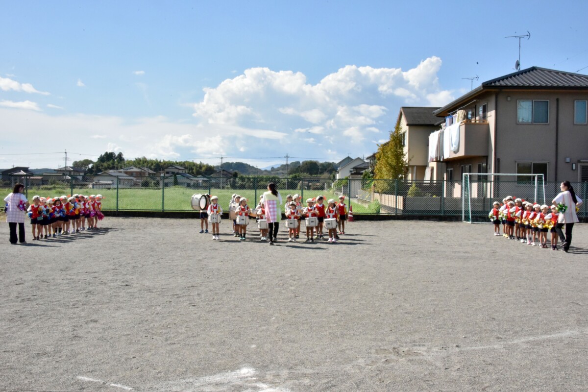 1学期からコツコツと練習に励んできた鼓笛活動ですが、いよいよお披露目の時を迎えました☆今日は他の学年のお友だちも第3グランドに集まり、年長組は運動会と同じ衣装を着て演奏を披露しました🎵