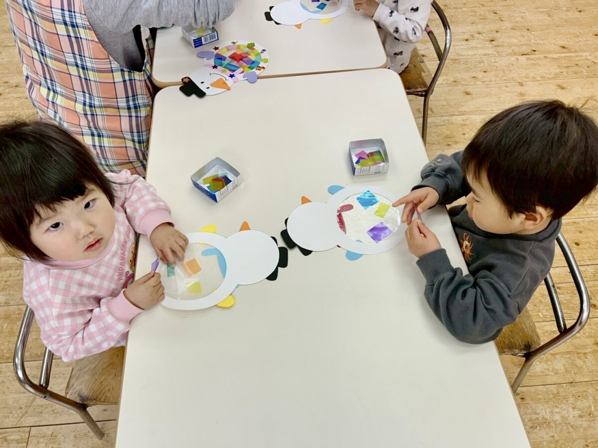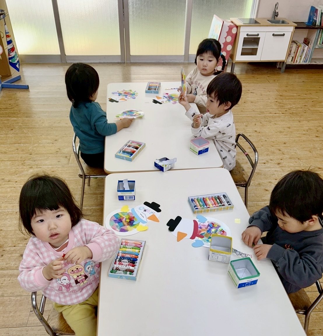 今日は雪だるまの制作を行いました⛄️💕雪だるまのお腹に色とりどりの透明フィルムを自由に貼り、可愛く飾り付け♡お顔もクレヨンで描きました🎵