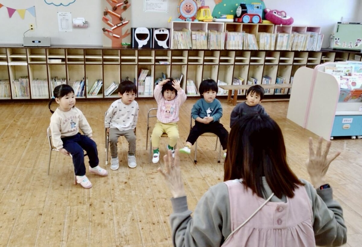 今月のまめっこくらぶ担当の先生は、みお先生👩♡おもちゃで遊んだ後は、みんなで保育室のお片付けをして、椅子に座ったら朝のご挨拶をします☀️名前を呼ばれたら「はーい!」と手をあげてお返事したり、朝の歌なども歌います★椅子に座れなかったり、お返事ができなくても大丈夫!✨おうちの人と離れて過ごすだけで、小さな子どもたちにとっては”大きな一歩”です😀!