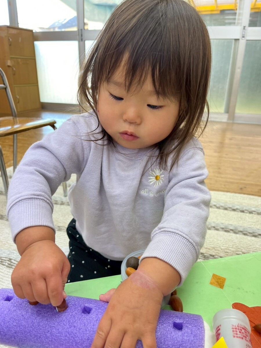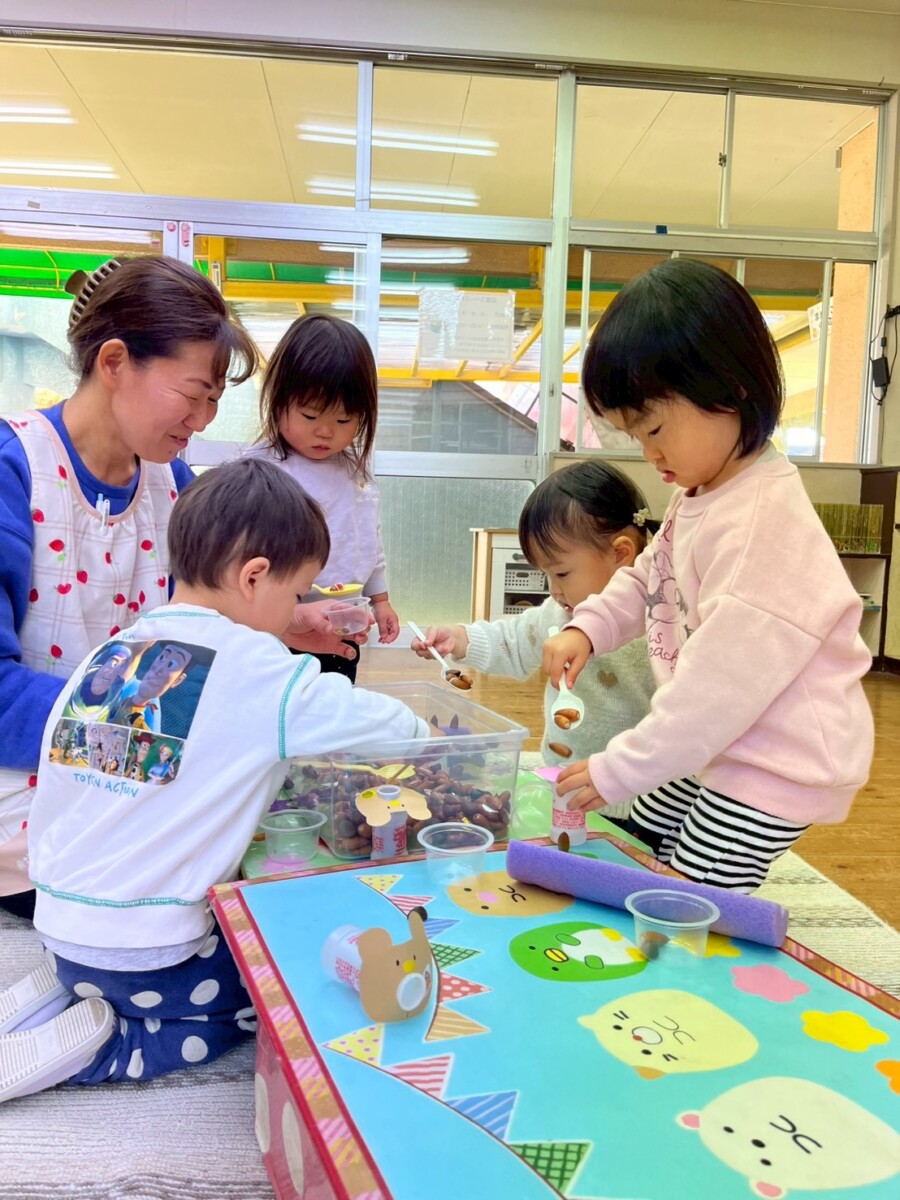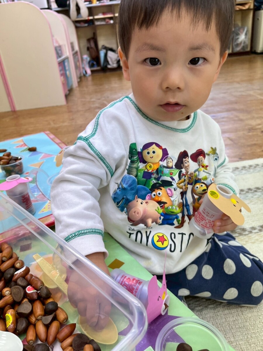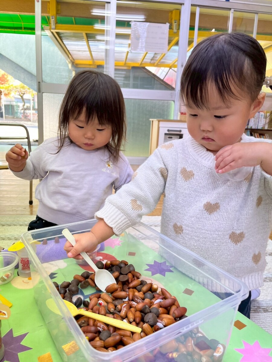 先月は秋の自然『どんぐり』が大人気!!🍂大量のどんぐりを使って、細かな遊びからダイナミックな遊びまで、夢中になって遊んでいました🎵一時預かり保育では、お給食も先生やお友だちと一緒に食べます⭐️