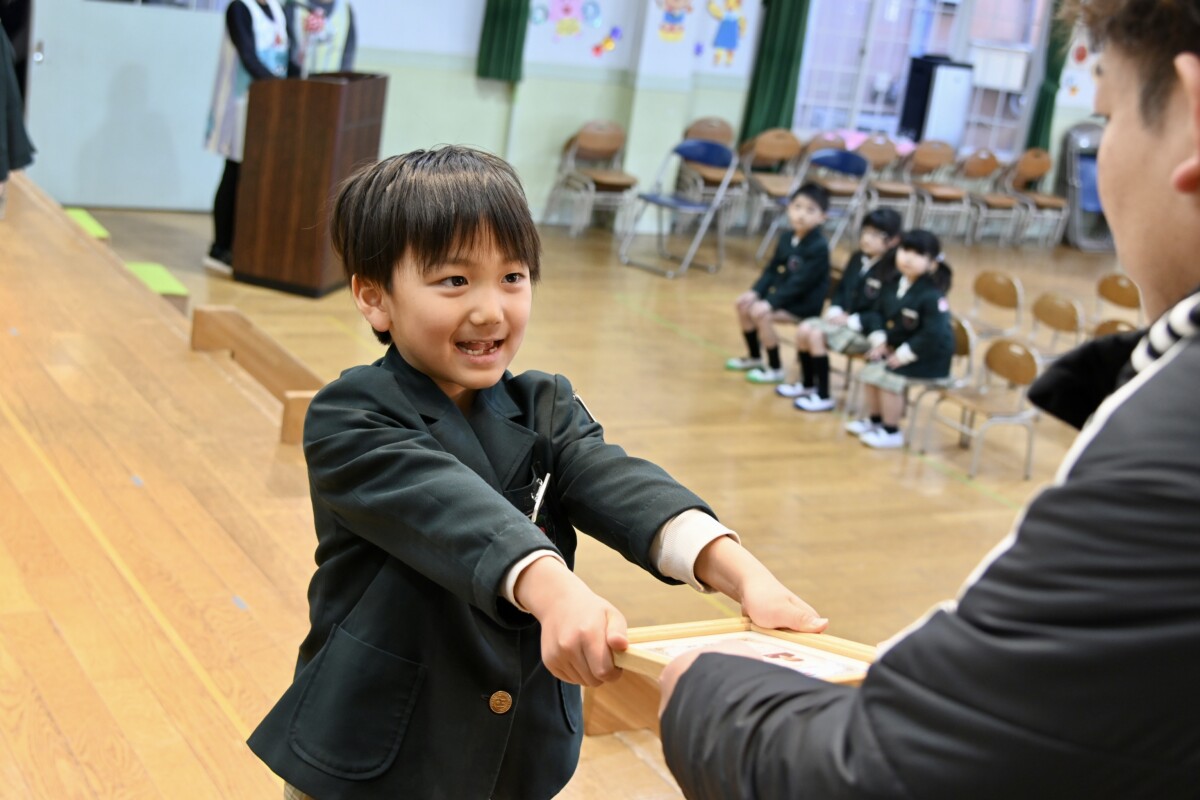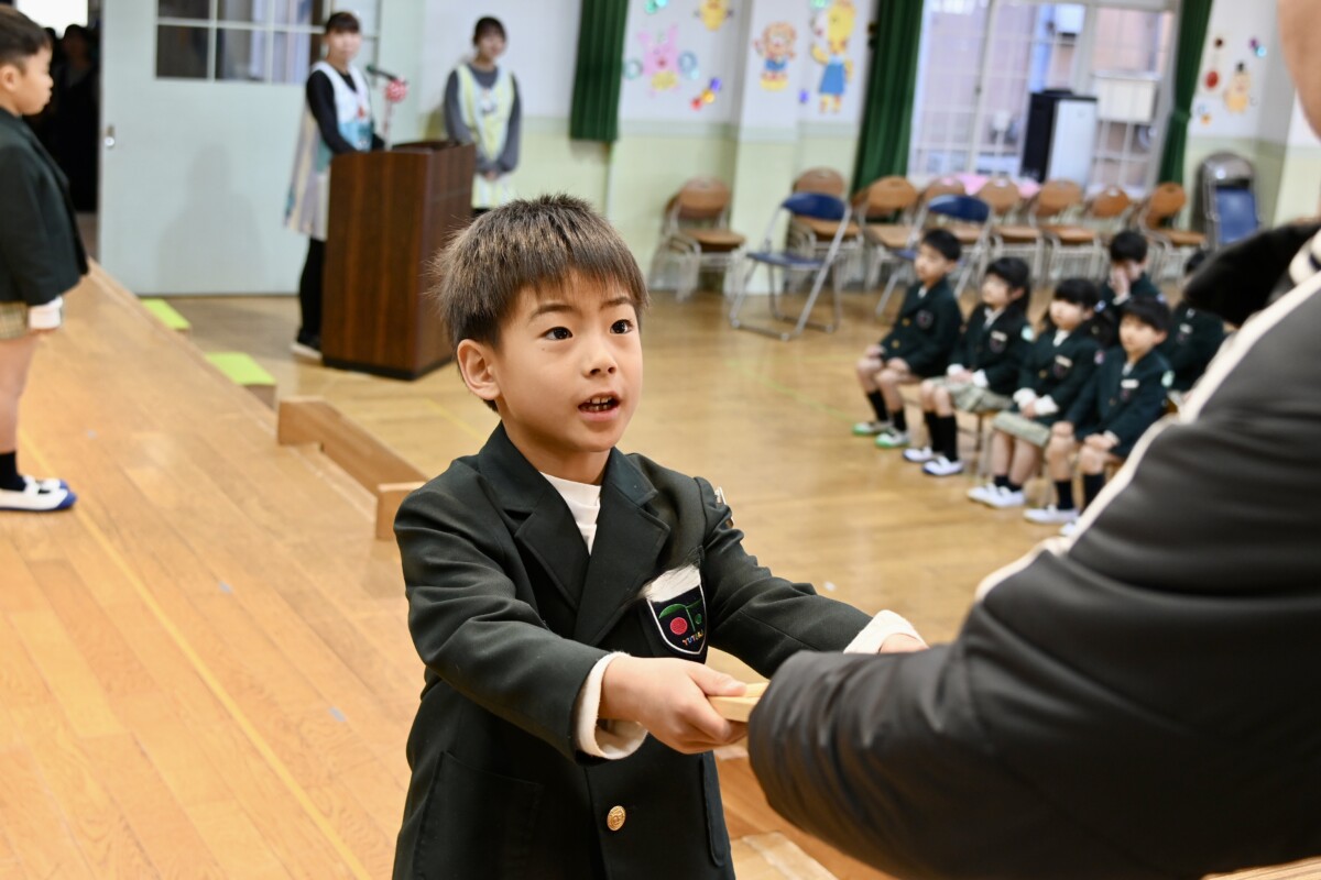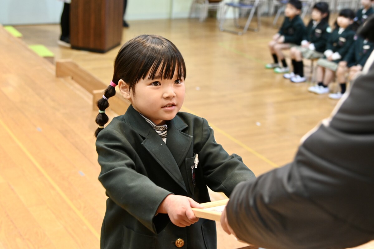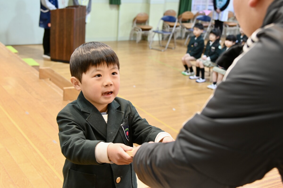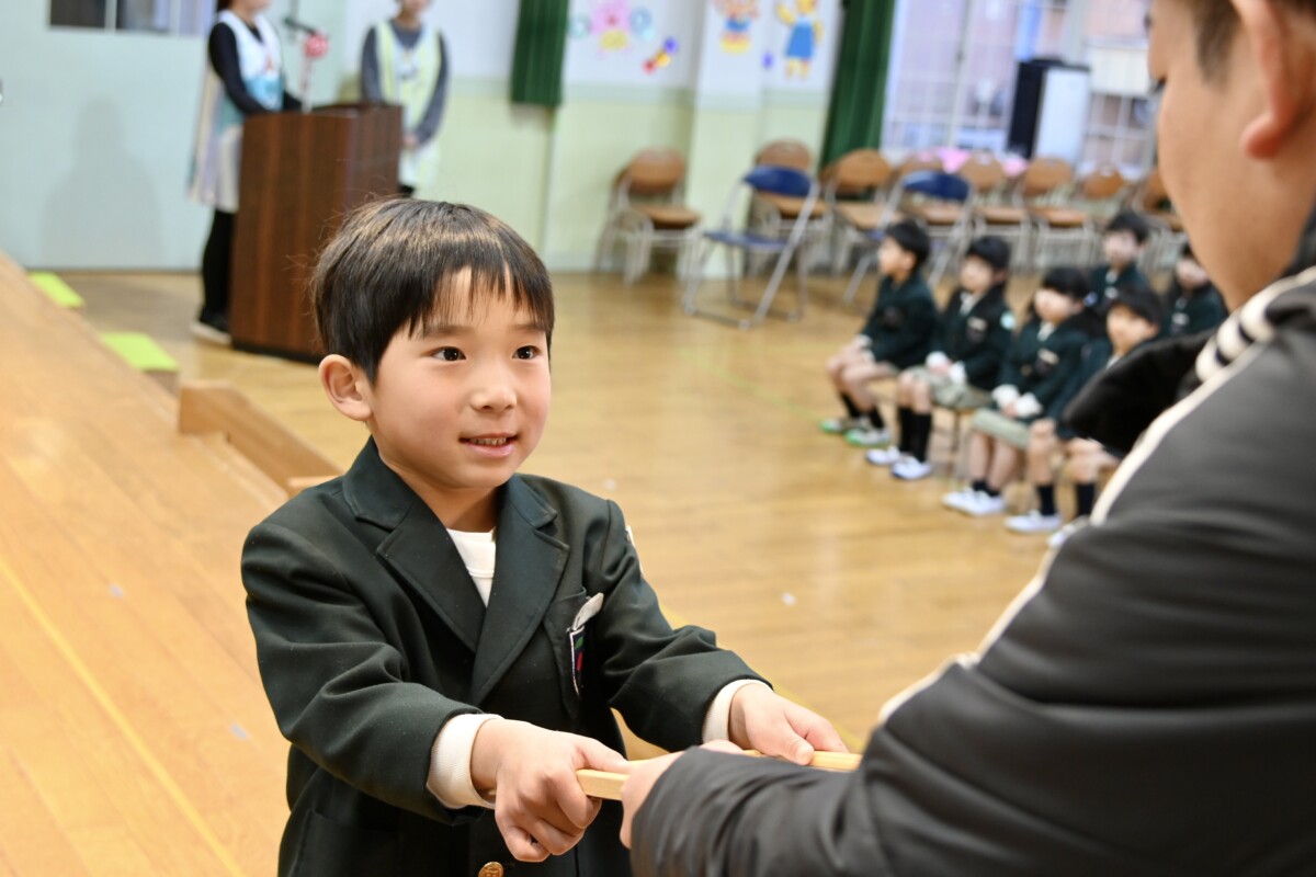 記念品授与では、代表のお友だちが舞台上に登って理事長先生・園長先生・PTA会長さんから記念品を受け取ります。背筋もピンっとなっていて、どの場面を切り取ってもかっこいい姿です✨