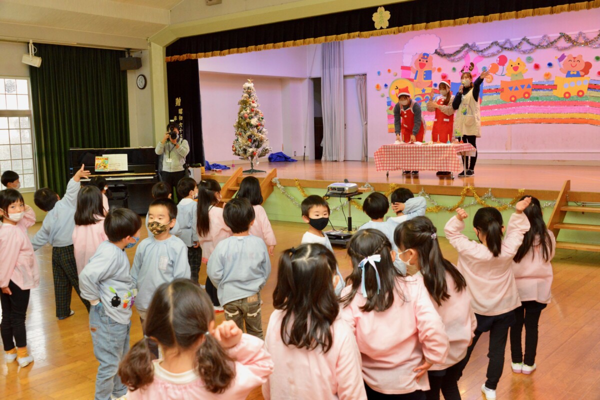 今年も二朗先生による熱演!「二朗先生だー!トナカイはみお先生だよー!」と口を揃える子どもたちでしたが、その表情はとびきりの笑顔で、サンタさんの姿に釘付けになっていました♪