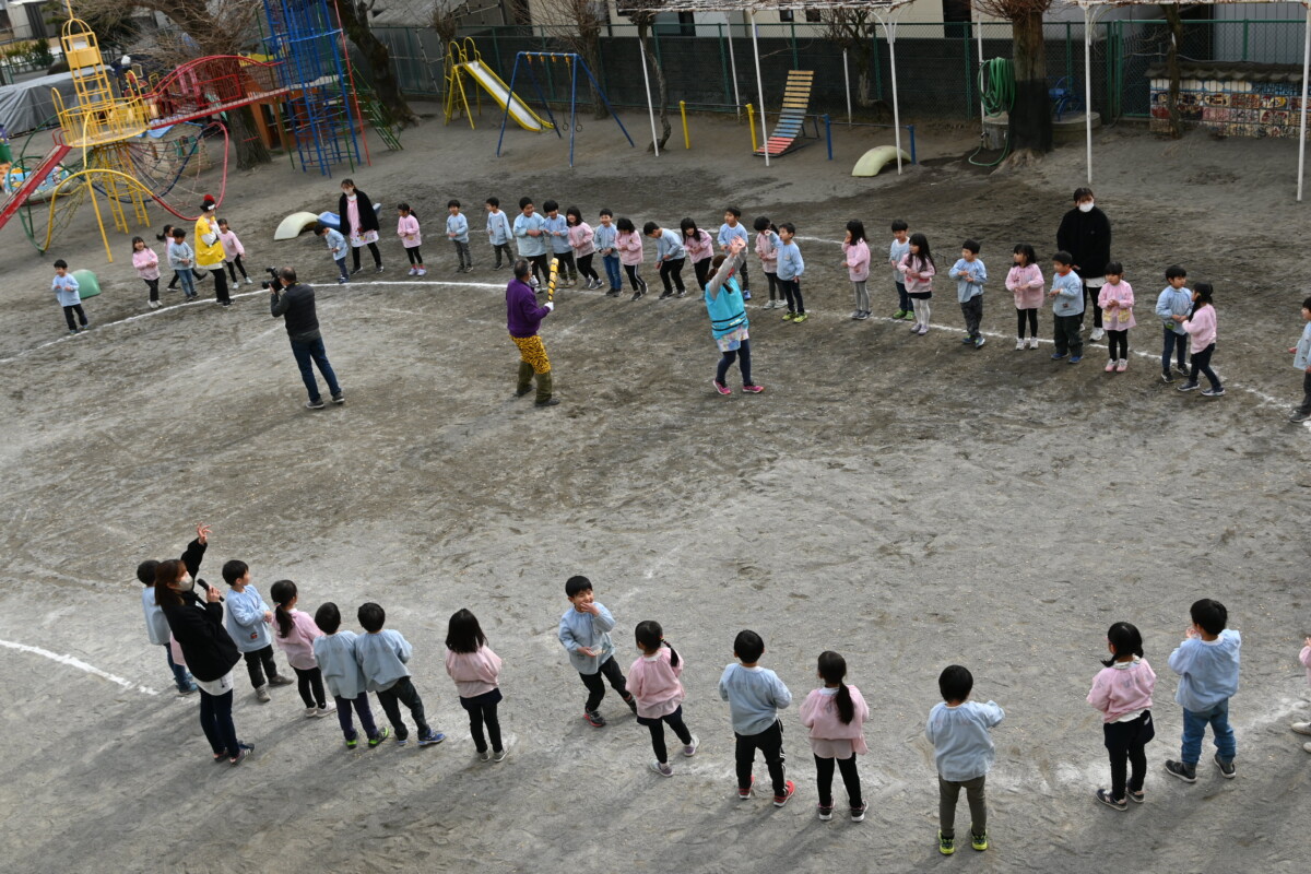 本日2月3日は『節分』ということで、幼稚園でも豆まきを行いました♪ 昨年度はコロナの影響で、各クラスごとに子どもたちが鬼役と豆を投げる役に分かれて、保育室で行った豆まきですが、今年は学年ごとに園庭での開催☆運転手さんや先生たちが扮する”鬼”が復活です★