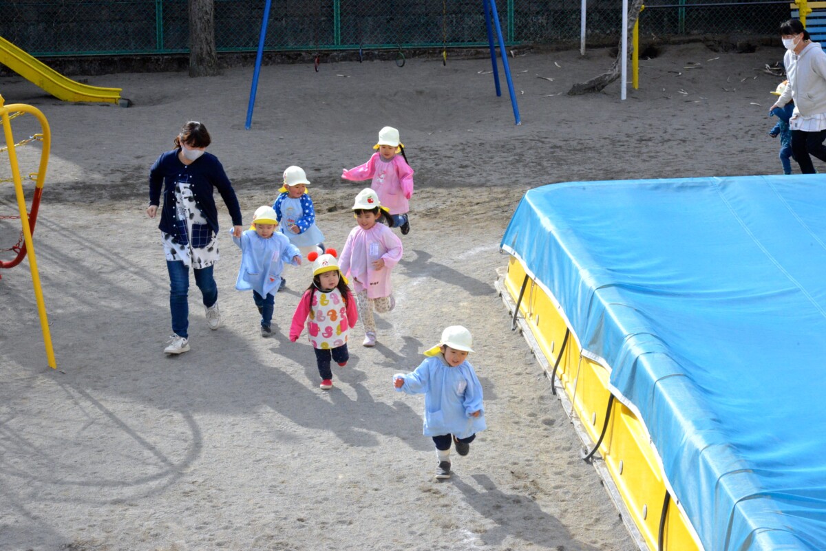 マラソンスタート!! 2021.02.09 コロナ禍で外出自粛要請が続く中、子どもたちの運動不足や体力低下などの弊害が指摘されています。 そんな中、幼稚園では今週から体力づくりの一環としてマラソンが始まりました!! 先生と一緒にスタートラインについたら、「よーい、どん☆」 今日は朝から全国的に真冬の寒さとなりましたが、ものともしない子どもたち!! 自分のペースで颯爽と風を切って走る姿は、「子供は風の子」の言葉そのまま☆ 日によって寒暖差が大きく風邪をひきやすい時期ですが、基礎体力をつけて免疫力も高めていきたいと思います♪
