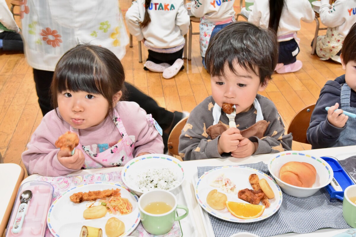 全部のメニューが揃ったら、みんなでお給食の歌を歌って『いただきます!』⭐️いつもの保育室とは違う環境でのお給食に、子どもたちはワクワク♡お友だちと楽しそうにお話をしながら食事をしました🎵