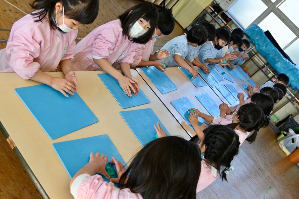 どんど焼きでは、焼いたまゆ玉を食べると病気になりにくいと言われていますが、幼稚園では本物のまゆ玉ではなく・・・、紙粘土を代用★