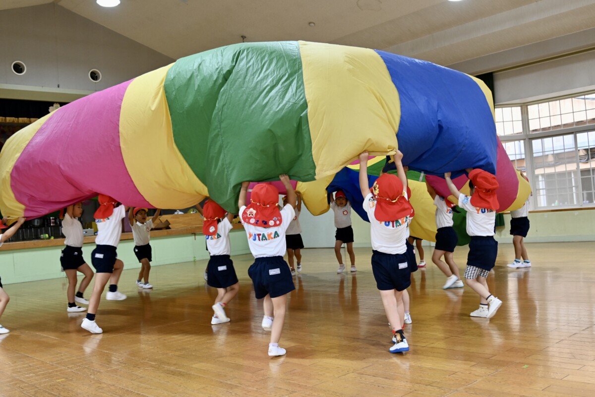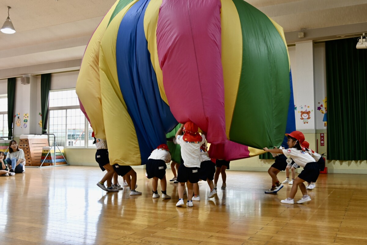 バルーンは全員が同じ動作を瞬時に行わないと、空気がうまく入らなかったり抜けてしまったりするため、一人一人が岡田先生の指示・笛の合図をよく聞き、その合図でどう動くかを身につける必要があります。また集中力もとっても大切です!まだまだ練習過程なので失敗が多いですが、何度も繰り返すうちに徐々に身についてきます。バルーンはみんなで協力しないとうまくできないことを学んだり、協調性を養んでいく活動の一つです⭐️