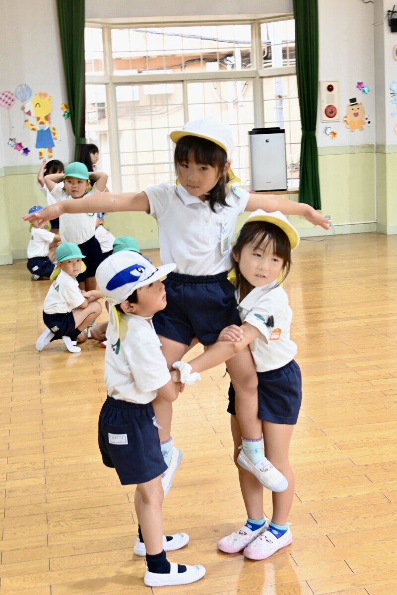 年長組の組体操は、1人の種目から2・3・6人の種目、全員の種目とあり、今日は3人組と6人組の種目の練習をしていました⭐️人数が増えていくにつれて難易度もあがっていきます。