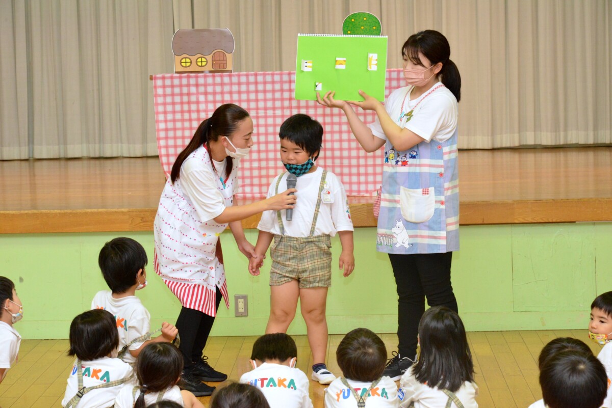 お誕生日会(年中組・7月) 2021.07.13 昨日に引き続き朝から晴れとなった今日☆ しかしそこまで気温は上がらず、昼ぐらいからは一転して雨となるなど、まだまだ不安定な天気。。。 九州北部や、中国地方では平年より早い梅雨明けとなりましたが、天気の急変には十分注意して過ごしたいですね!! 写真は年中組さんのお誕生会の様子♪ 今週末に行われる「ゆたか夏祭り」に向けて、勇気音頭の練習もバッチリ☆ その後はクイズやアリとキリギリスのお話など、先生たちの出し物を楽しんでいました♡ 7月生まれの年中組さん、お誕生日おめでとうございます!!