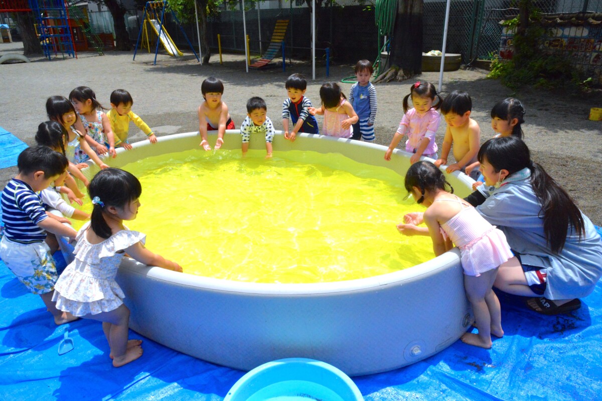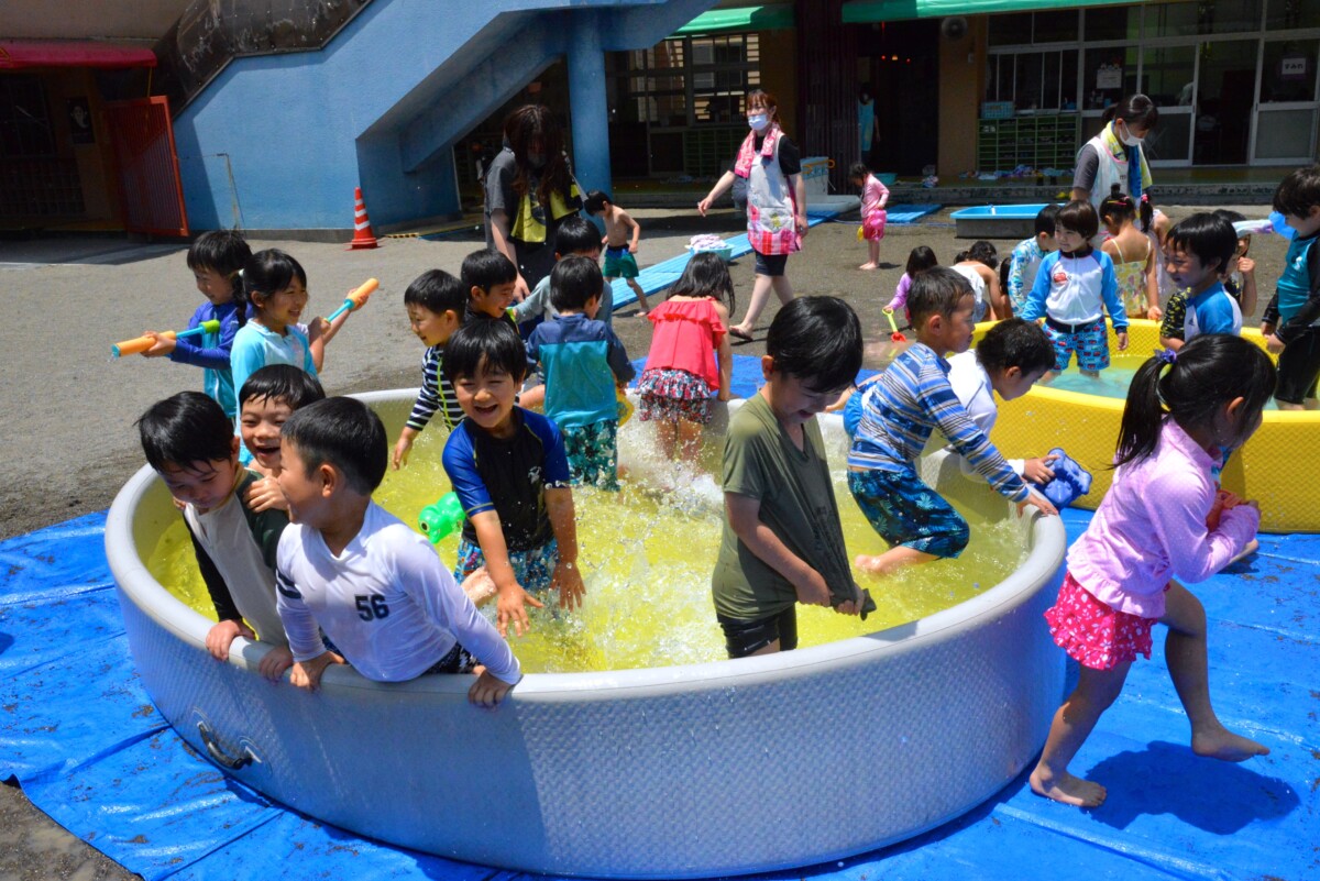 園庭での水遊びとなりましたが、年少・ひよこ組さんは初めての活動にも楽しんで取り組むことができていました♪