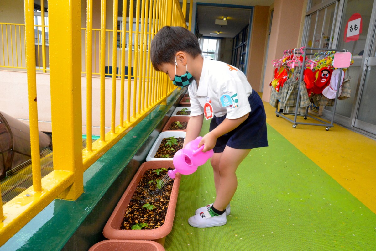 双葉が開いて・・・♡ 2021.06.04 今日は昨日と打って変わって雨の一日となりました。 午後〜夜にかけて、局地的に大雨や暴風となるところもあるそうなので、十分に注意したいですね!! 年中組さんが育てている朝顔は、吹き込む雨にも負けず元気に成長中☆ 種まきから二週間が経ち、双葉がしっかりと開いてきました♪ 子どもたちも日に日に大きくなる朝顔が気になるようで、毎日のように様子を観察する姿が見られています☆ あと一週間ほどすると本葉が出始め、葉も茎も急速に大きくなる時期になるので、子どもたちと一緒に成長を楽しみたいと思います♡