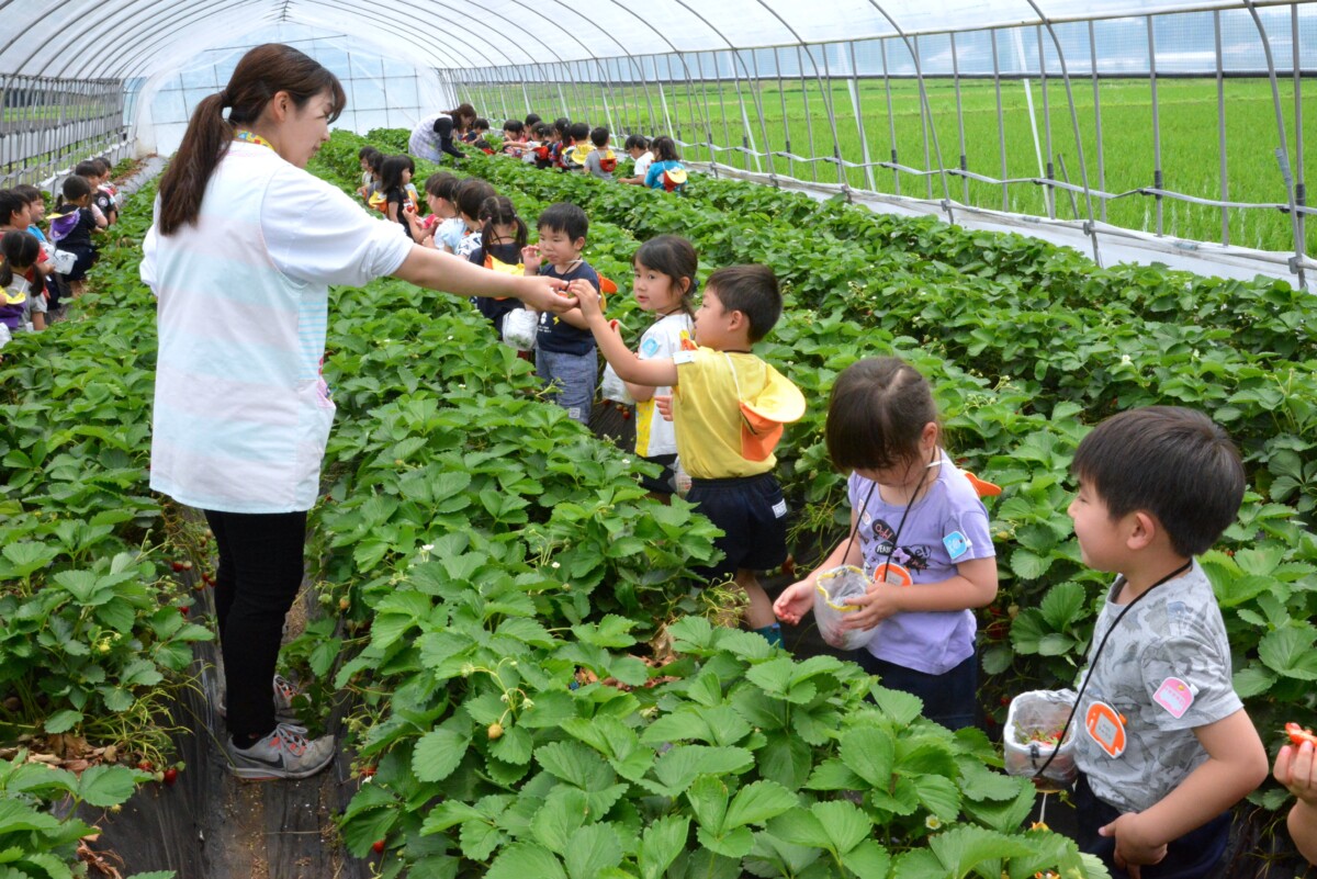 年中組いちご狩り(2回目)!! 2021.06.07 先週から始まったいちご狩りも、いよいよ2週目☆ 「来週食べる分残ってるかなぁ?」という子どもたちの心配をよそに、3日間入らなかっただけで、ビニールハウスの中は真っ赤ないちごがいーっぱい♡ 今年も最後まで目一杯いちご狩りを楽しむことができそうです♪ 先週金曜日に続き、今日は年中組さん!! 暑い中での活動となりましたが、汗を拭うよりもいちごを探す方に集中していた子どもたち♪ お友達や先生と大きさを競いながら、最後まで楽しく活動することができました♡