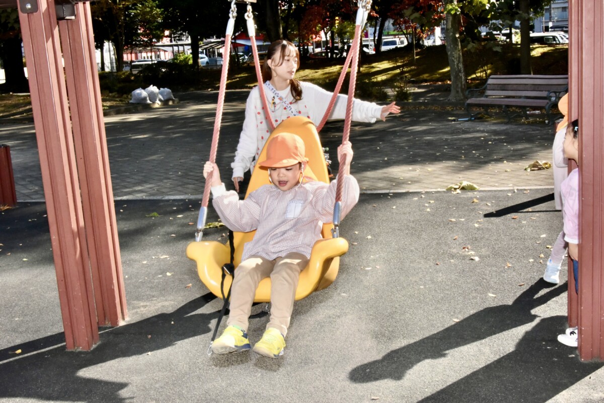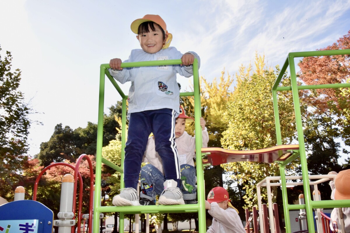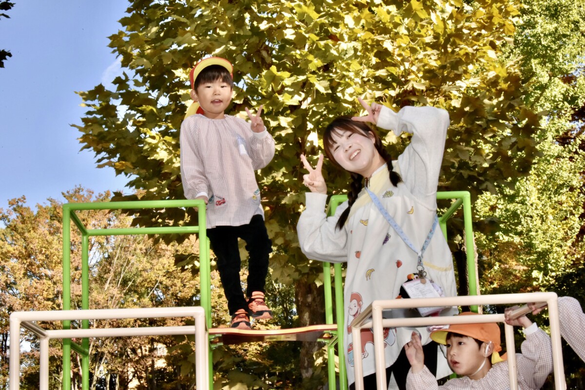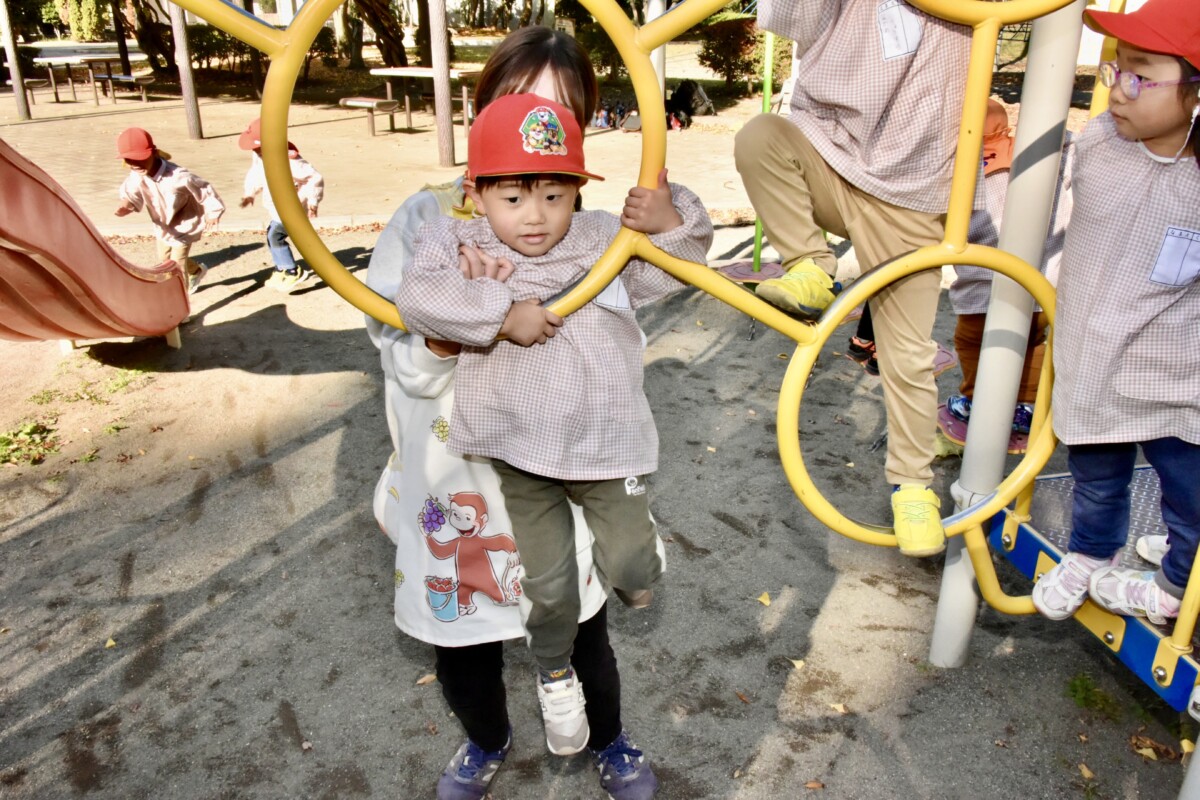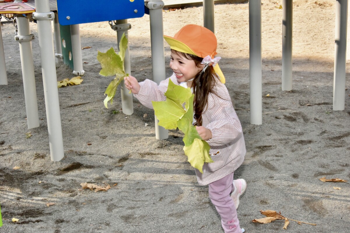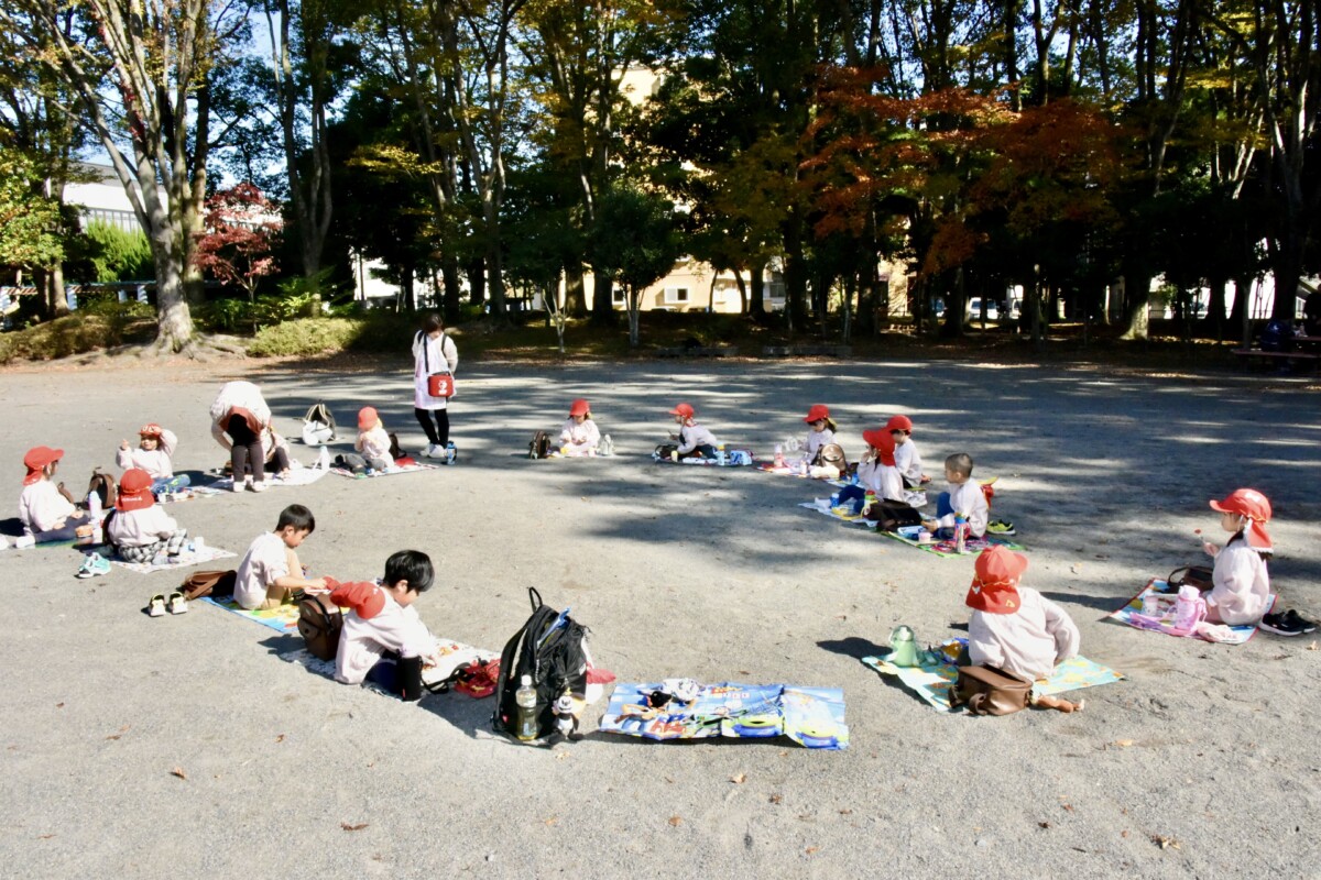 銀杏並木はまだ黄色になってはいませんでしたが、足元には銀杏がたくさん落ちていて、辺りはすごい匂い!!お世辞にも「いいにおい」とは言えませんが、子どもたちはそんな秋の自然にも触れながら、並木道を歩いて公園内まで向かいました😄