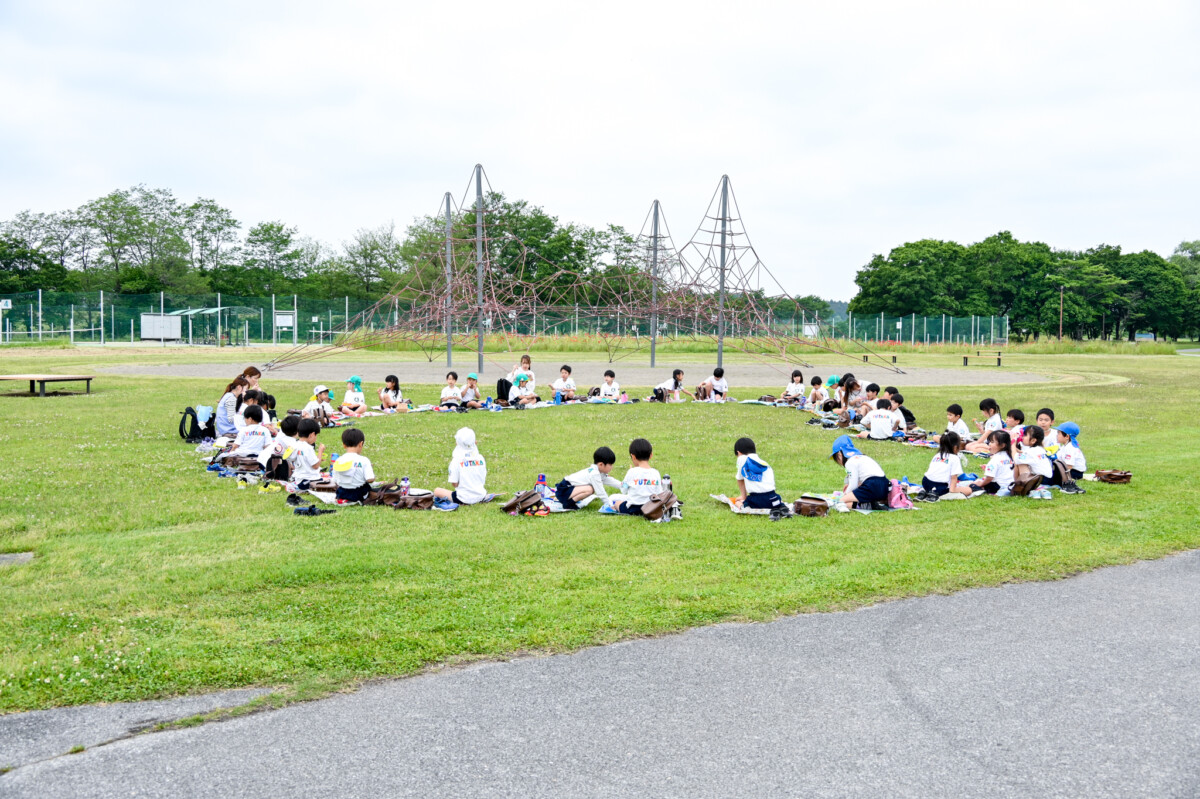 そうこうしている間にお昼の時間になったので、みんなで大きな円を作ってランチタイム♡おうちの人が作ったお弁当を嬉しそうに「見て見て〜!」「おいしそう〜♡」と言いながら、お友だちや先生と一緒に美味しく食べました😋その後は、通称『くじら公園』の遊具でお遊びタイム🎵