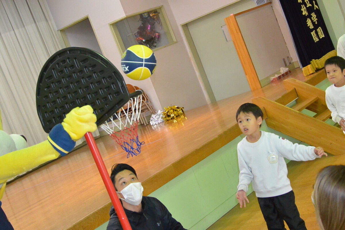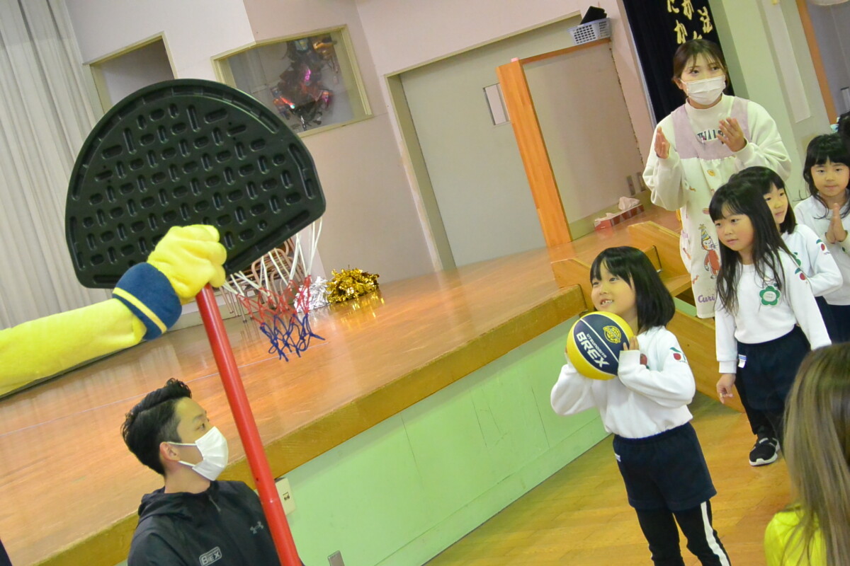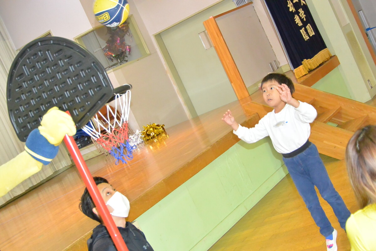 その後は、実際のボールとゴールを使って、バスケ体験☆ブレッキーがまず見本を見せてくれました。
