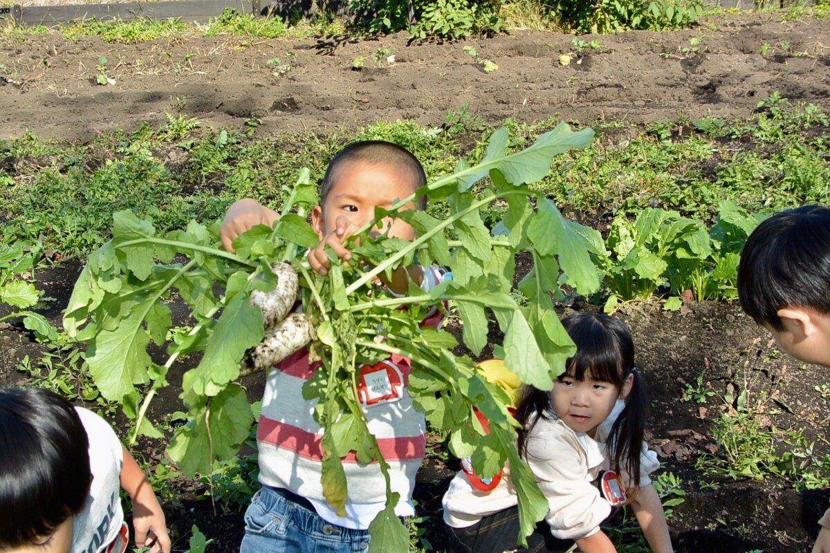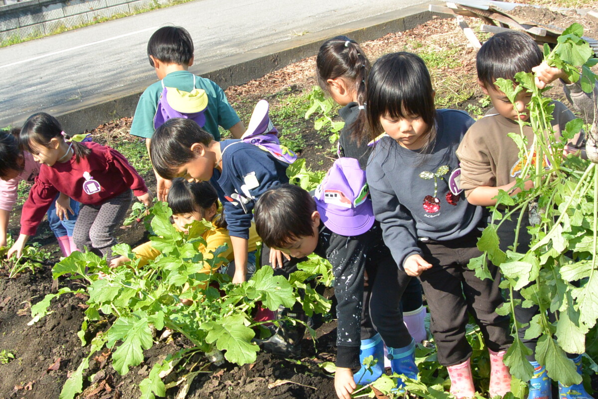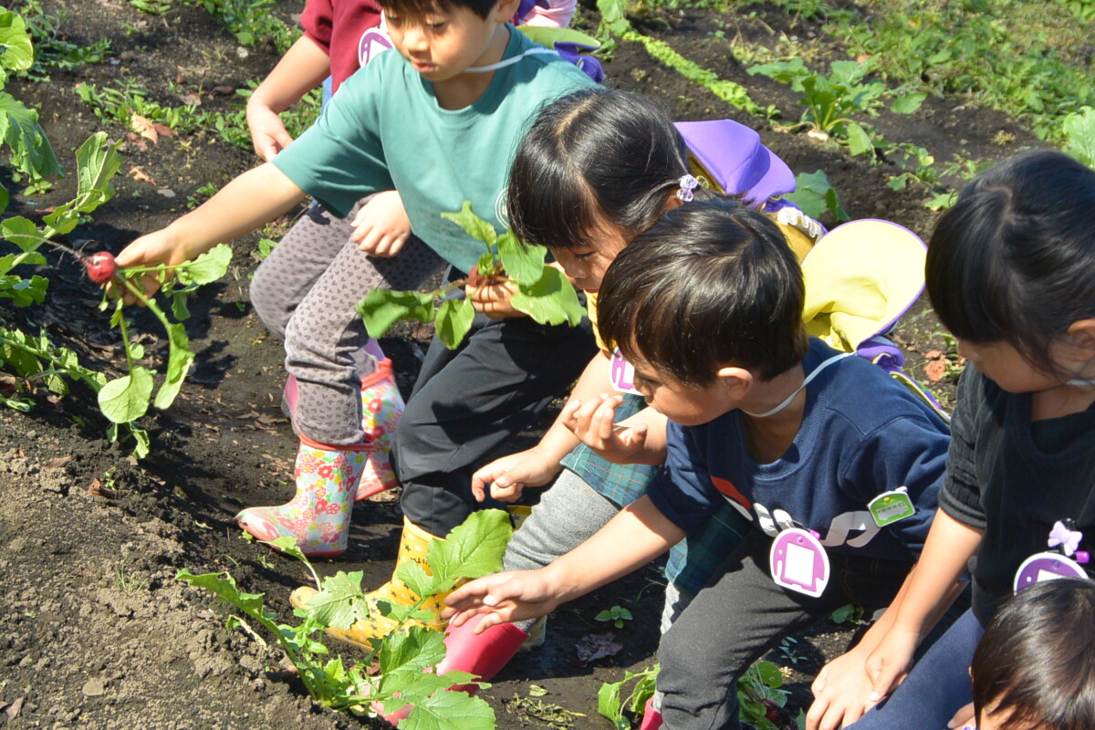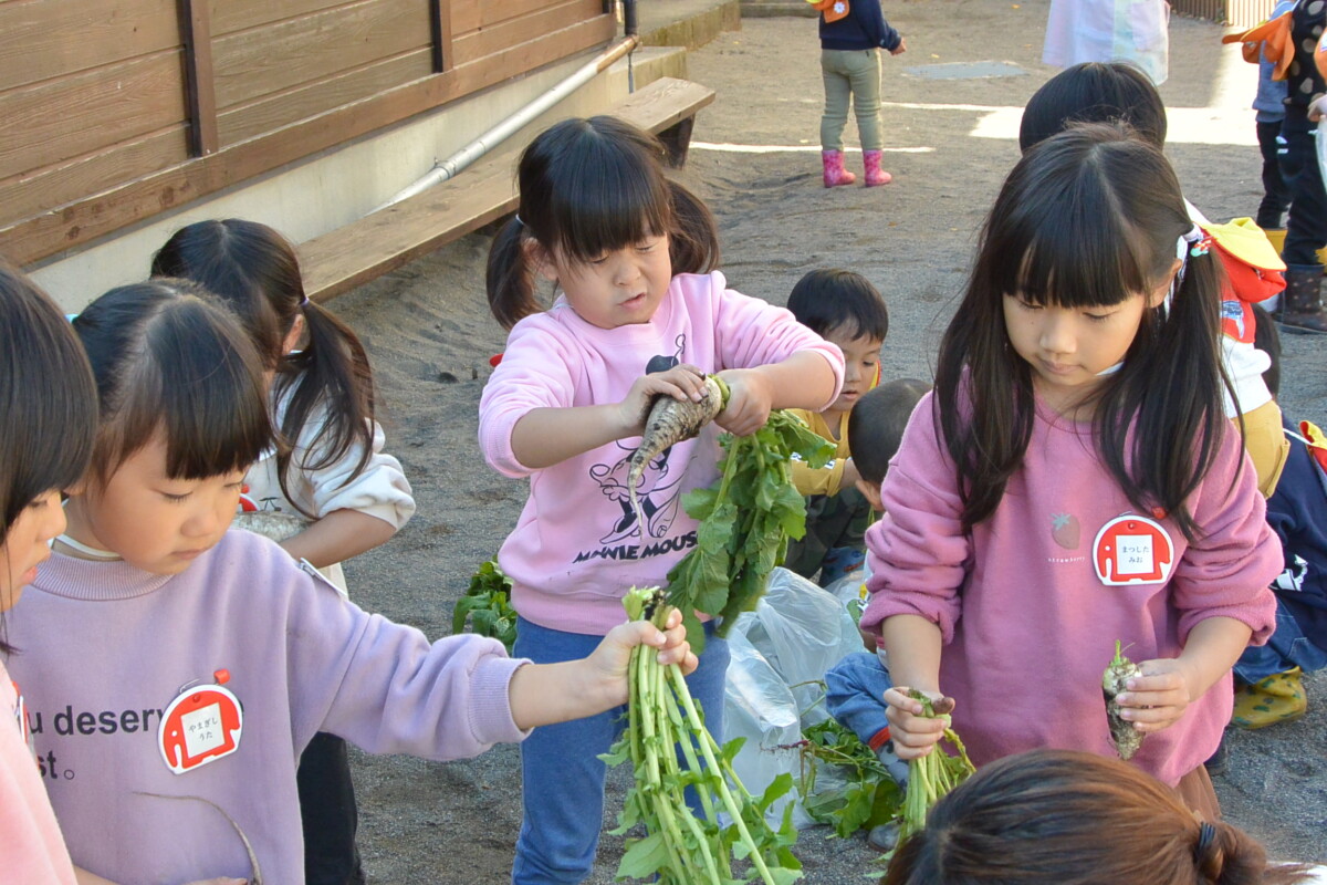 今日は年中組が野菜収穫を行いました★年中組が野菜の種を植えたのは、9月12日♪ あれから2ヶ月が経ち、はつか大根とミニ大根は、とっても立派に成長しました!!
