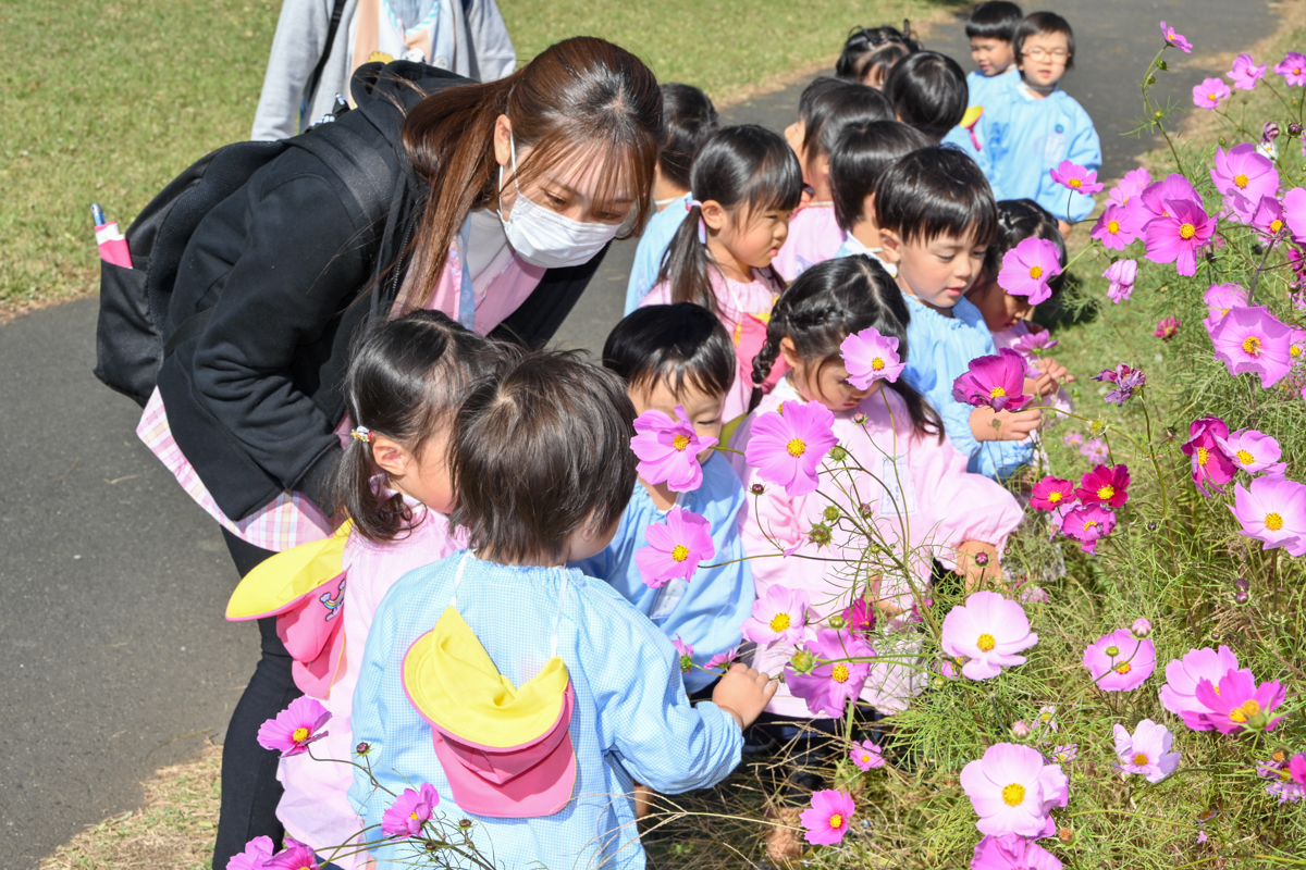 今日は年少組がゆうゆうパークのコスモス畑に出かけました♪年少組は延期がさらに延期になってしまい、当初の予定から3週間も遅れてしまいましたが、今日はとっても良いお天気のもとで、行ってくることができました(^ ^)