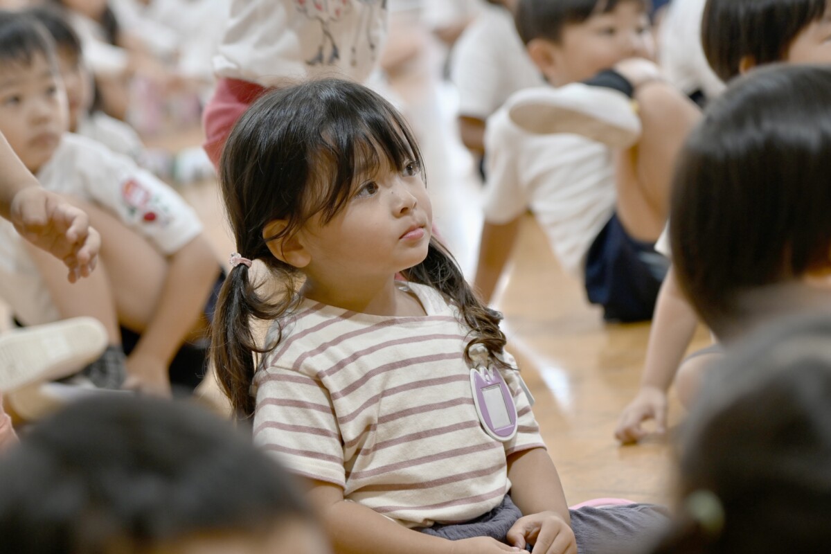 体操の後は、先生たちの出し物🎶 今月は『ももたろう』のペープサートです⭐️このお話は昨年度のもも組が発表会で行なった題目だったり、絵本で読んだことがあるという子も多く、子どもたちは親しみの気持ちを持ちながら鑑賞していました🎵