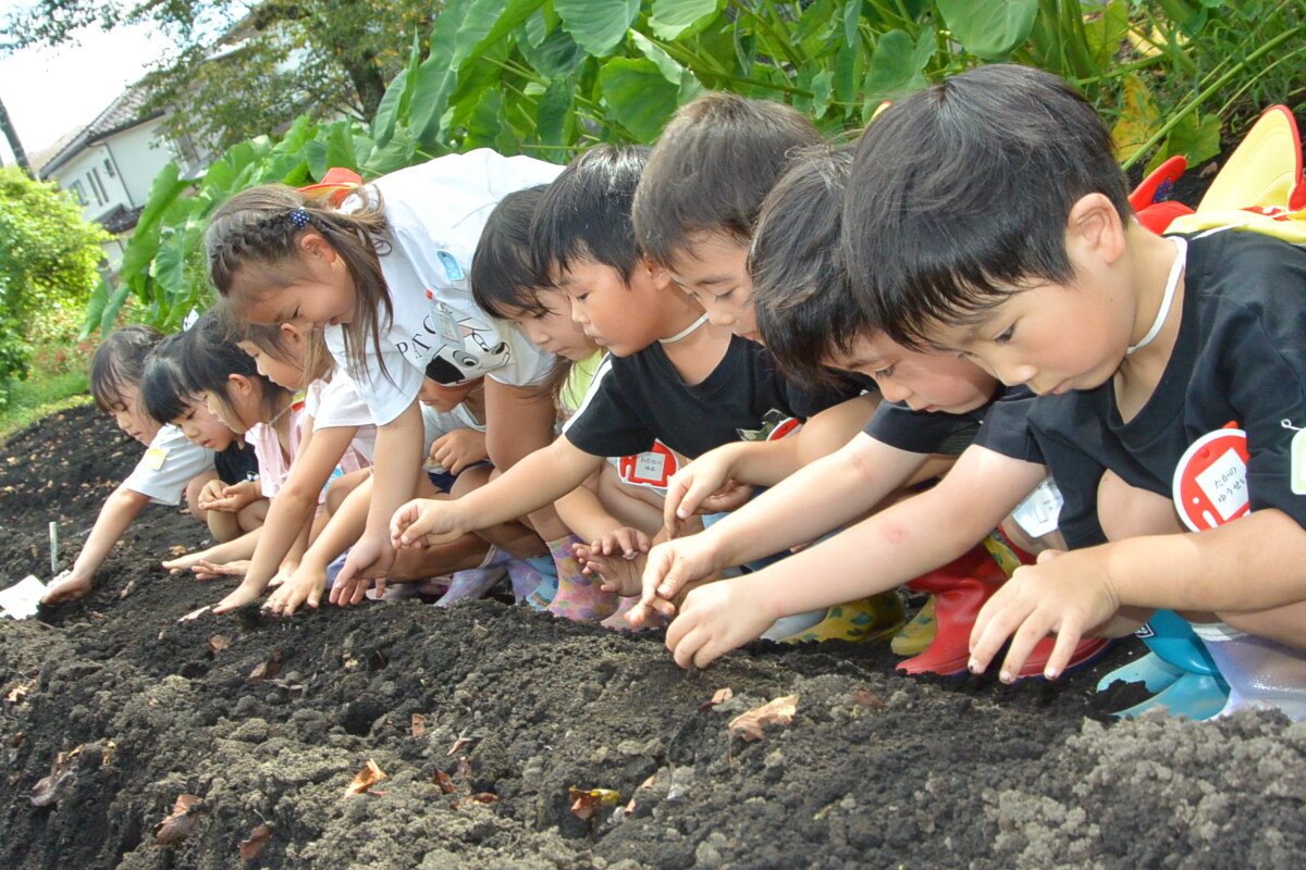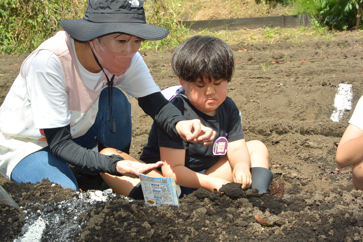 今日は澄み渡る青空のもと、年少・年中組がゆたかファームで野菜の種まきを行いました。年少組はサラダかぶ、年中組ははつか大根とミニ大根を植えます★