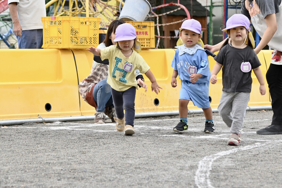 笛の合図で元気いっぱい走り出す子どもたち🎵小さな体で一生懸命走る姿はとても可愛くてずっと見ていたくなります♡年少組はトラックの半周を走りますが、スタートからゴールまであっという間なので、見逃さないようにしてくださいね☺️