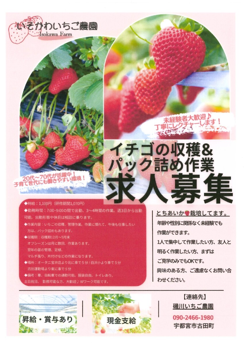 例年、いちご狩りでお世話になっている「磯川いちご農園」さんより、求人掲載の依頼がありましたのでお知らせします🍓